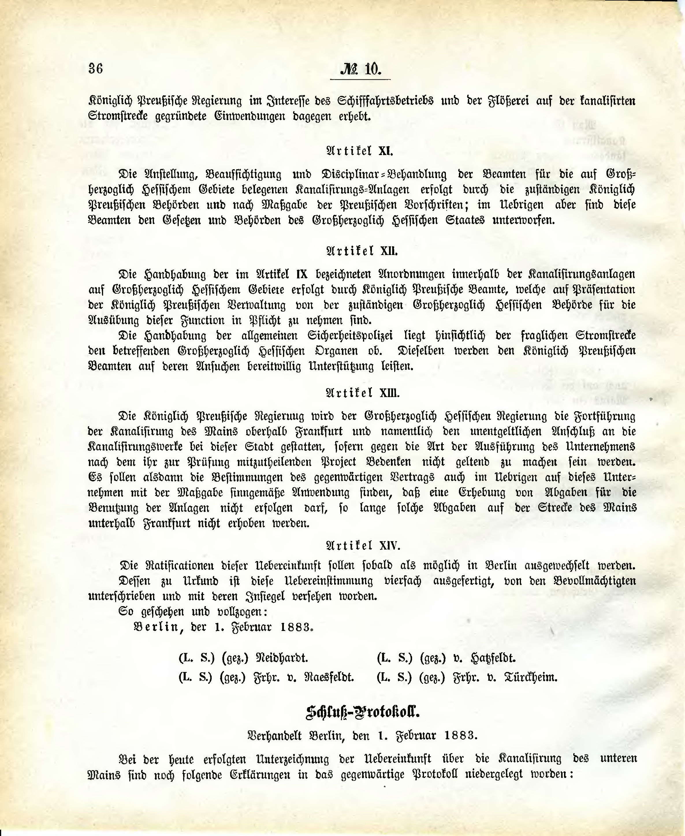 Die Königlich Preußische Regierung wird der Großherzoglich Hessischen Regierung die Fortführung der Kanalisirung des Mains oberhalb Frankfurt und namentlich den unentgeltlichen Anschluß an die Kanalisirungswerke bei dieser Stadt gestatten, sofern gegen die Art der Ausführung des Unternehmens nach dem ihr zur Prüfung mitzutheilenden Project Bedenken nicht geltend zu machen sein werden. Es sollen alsdann die Bestimmungen des gegenwärtigen Vertrags auch im Uebrigen auf dieses Unternehmen mit der Maßgabe sinngemäße Anwendung finden, daß eine Erhebung von Abgaben für die Benutzung der Anlagen nicht erfolgen darf, so lange solche Abgaben auf der Strecke des Mains unterhalb Frankfurt nicht erhoben werden.