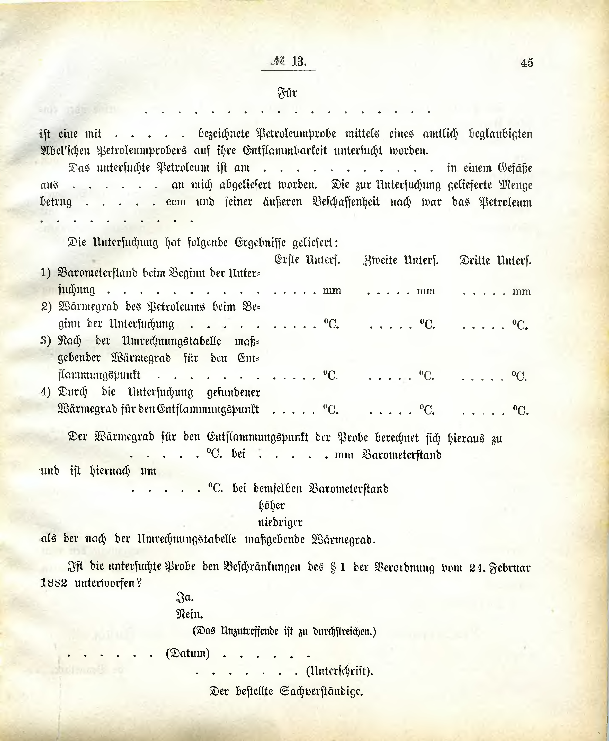 Das untersuchte Petroleum ist am ........... in einem Gefäße aus ...... an mich abgeliefert worden. Die zur Untersuchung gelieferte Menge betrug ....... ccm und seiner äußeren Beschaffenheit nach war das Petroleum ..........