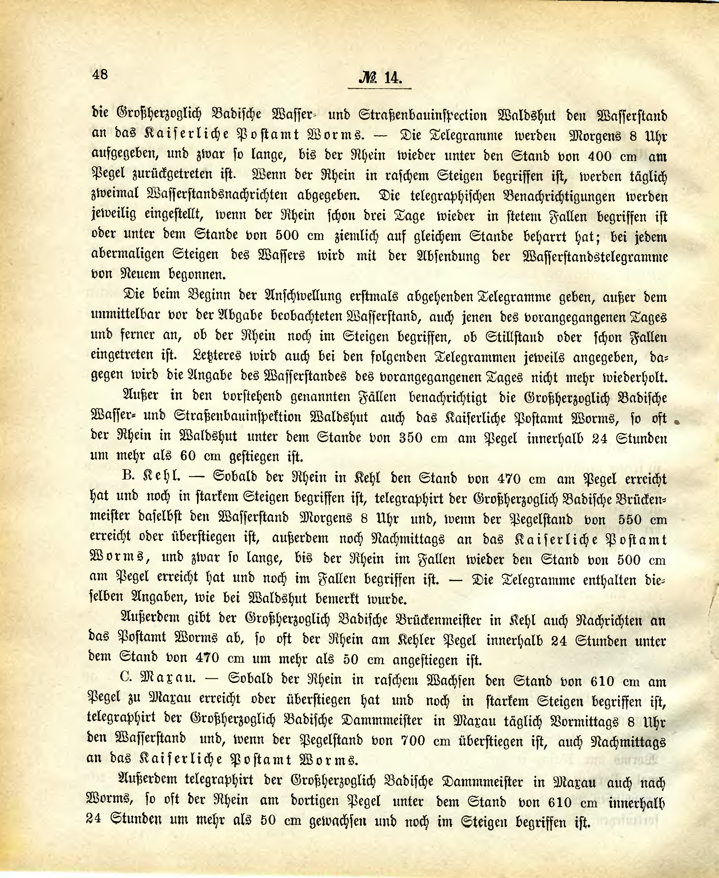 Außerdem gibt der Großherzoglich Badische Brückenmeister in Kehl auch Nachrichten an das Postamt Worms ab, so oft der Rhein am Kehler Pegel innerhalb 24 Stunden unter dem Stand von 470 cm um mehr als 50 cm angestiegen ist.