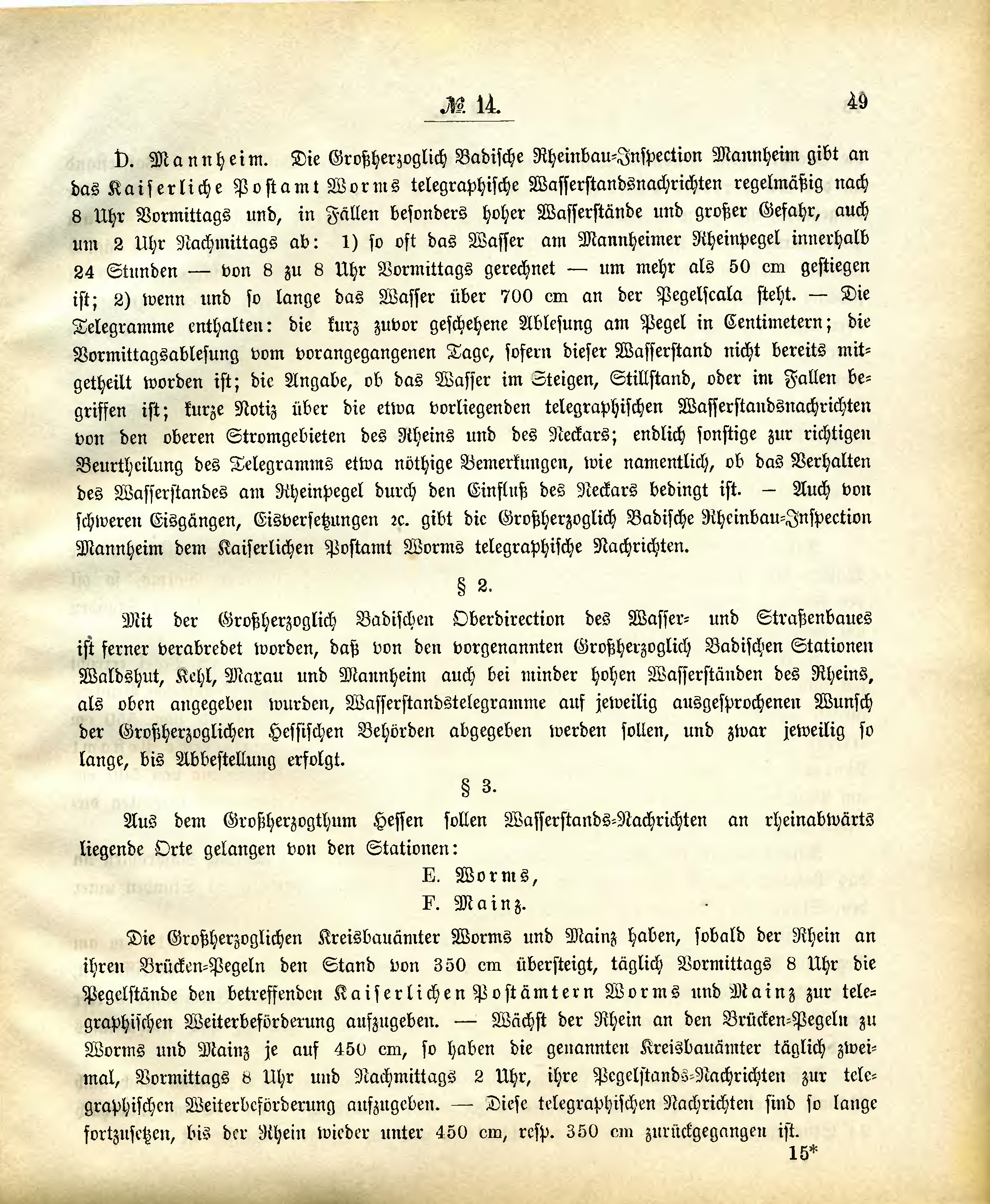 Die Großherzoglichen Kreisbauämter Worms und Mainz haben, sobald der Rhein an ihren Brücken-Pegeln den Stand von 350 cm übersteigt, täglich Vormittags 8 Uhr die Pegelstände den betreffenden Kaiserlichen Postämtern Worms und Mainz zur telegraphischen Weiterbeförderung aufzugeben. - Wächst der Rhein an den Brücken-Pegeln zu Worms und Mainz je auf 450 cm, so haben die genannten Kreisbauämter täglich zweimal, Vormittags 8 Uhr und Nachmittags 2 Uhr, ihre Pegelstands-Nachrichten zur telegraphischen Weiterbeförderung aufzugeben. - Diese telegraphischen Nachrichten sind so lange fortzusetzen, bis der Rhein wieder unter 450 cm, resp. 350 cm zurückgegangen ist.