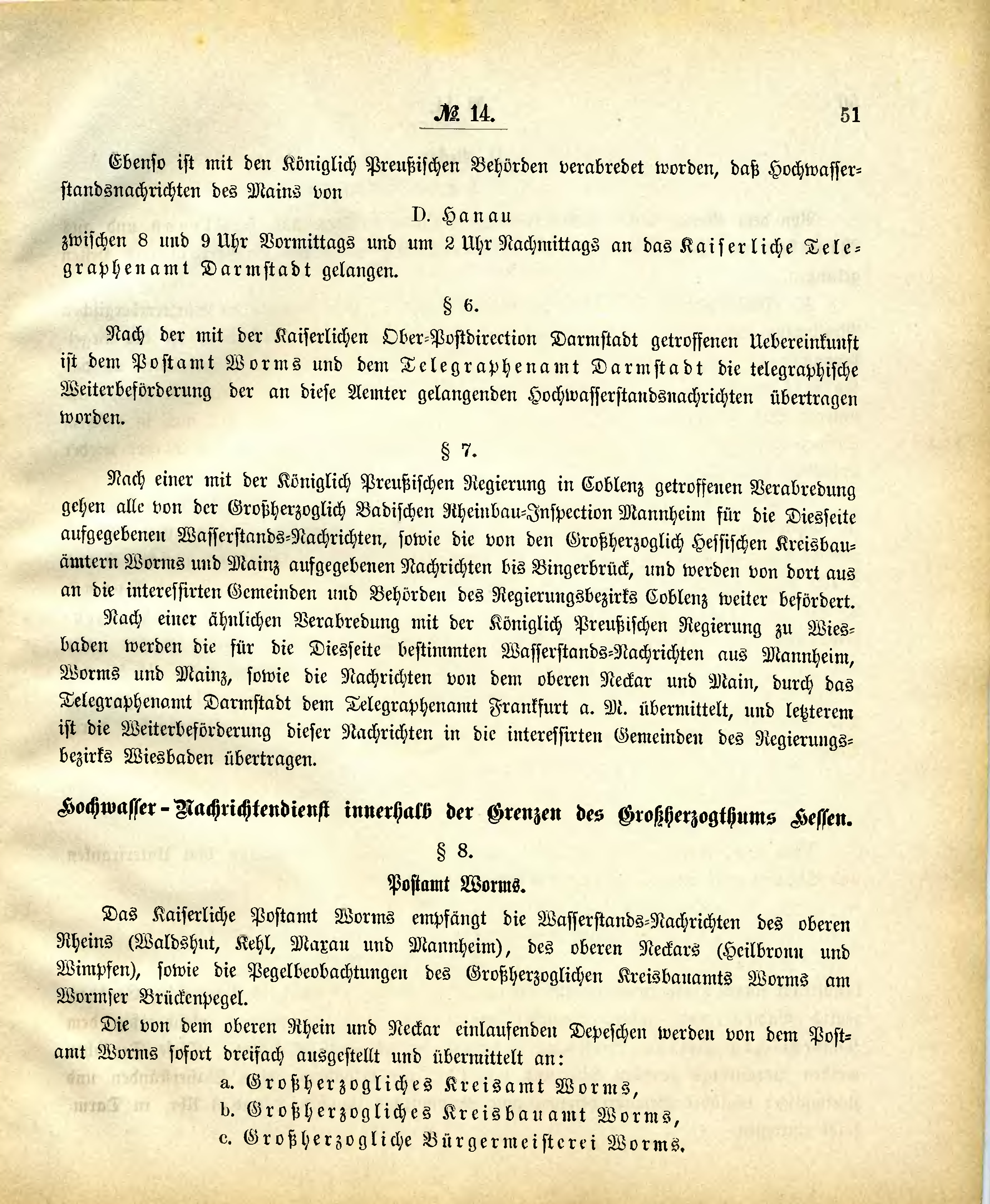 Nach der mit der Kaiserlichen Ober-Postdirection Darmstadt getroffenen Uebereinkunft ist dem Postamt Worms und dem Telegraphenamt Darmstadt die telegraphische Weiterbeförderung der an diese Aemter gelangenden Hochwasserstandsnachrichten übertragen worden.