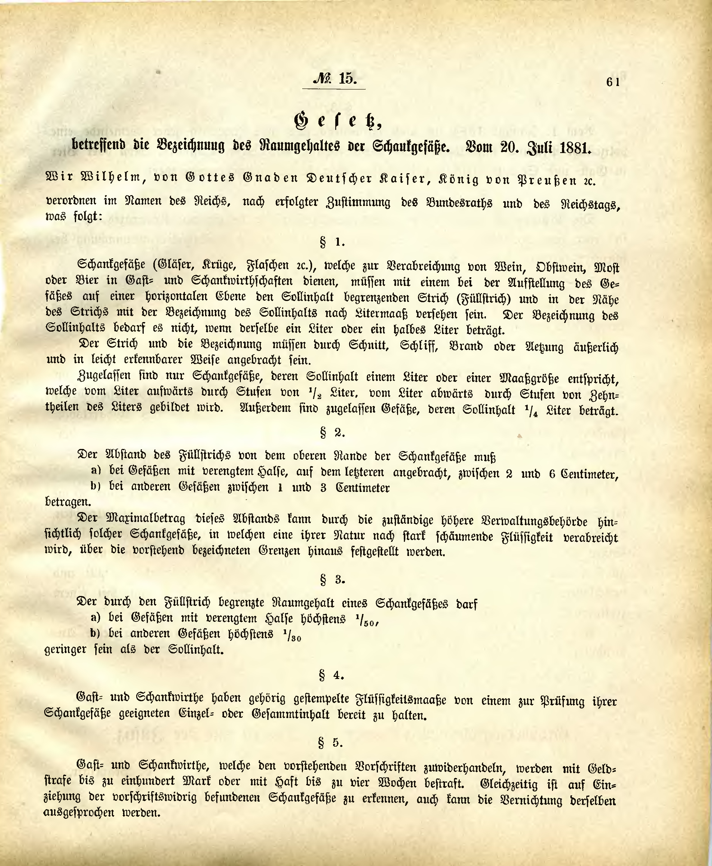 betreffend die Bezeichnung des Raumgehaltes der Schankgefäße. Vom 20. Juli 1881.