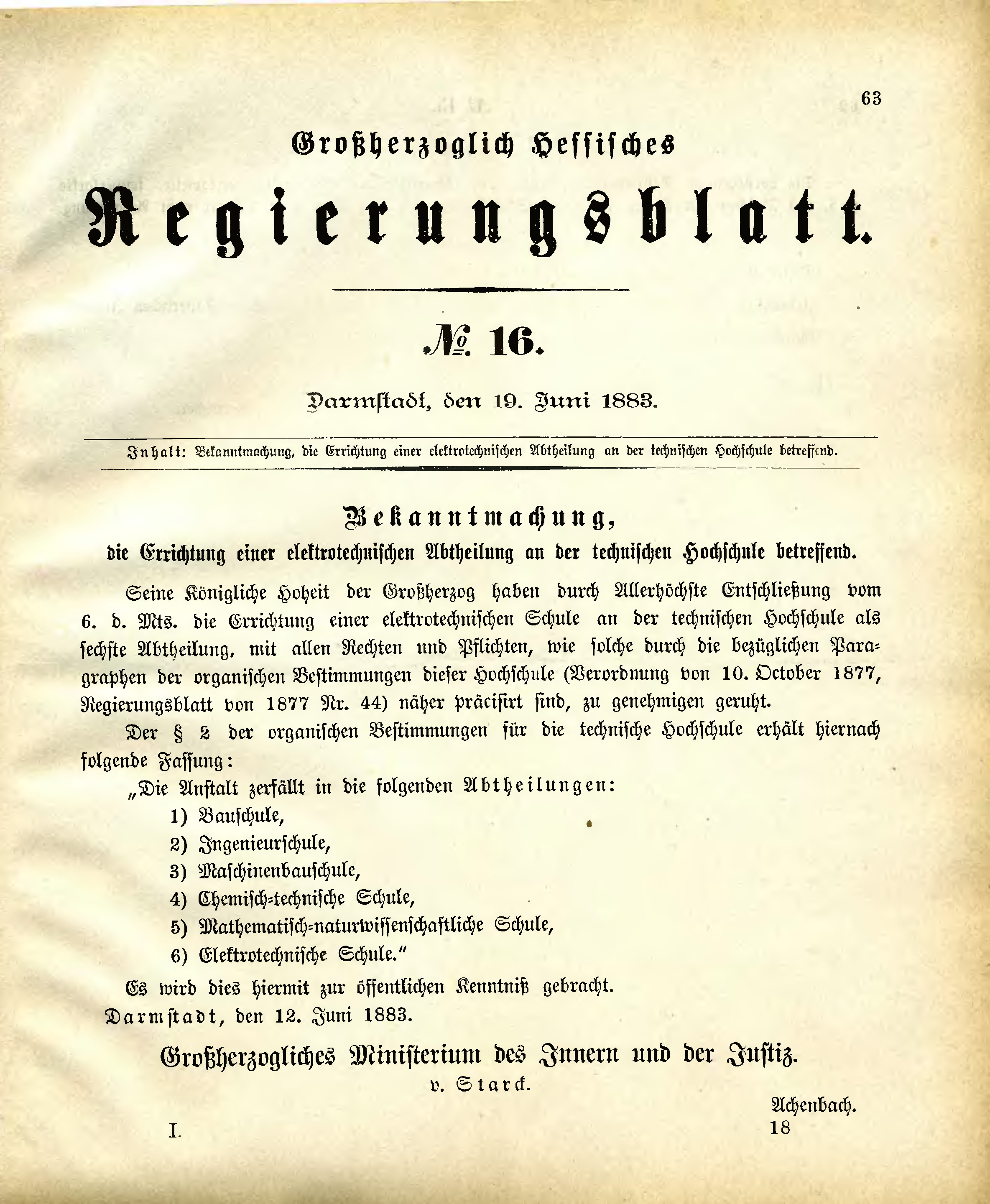 Seine Königliche Hoheit der Großherzog haben durch Allerhöchste Entschließung vom 6. d. Mts. die Errichtung einer elektrotechnischen Schule an der technischen Hochschule als sechste Abtheilung, mit allen Rechten und Pflichten, wie solche durch die bezüglichen Paragraphen der organischen Bestimmungen dieser Hochschule (Verordnung von 10. October 1877, Regierungsblatt von 1877 Nr. 44) näher präcisirt sind, zu genehmigen geruht.