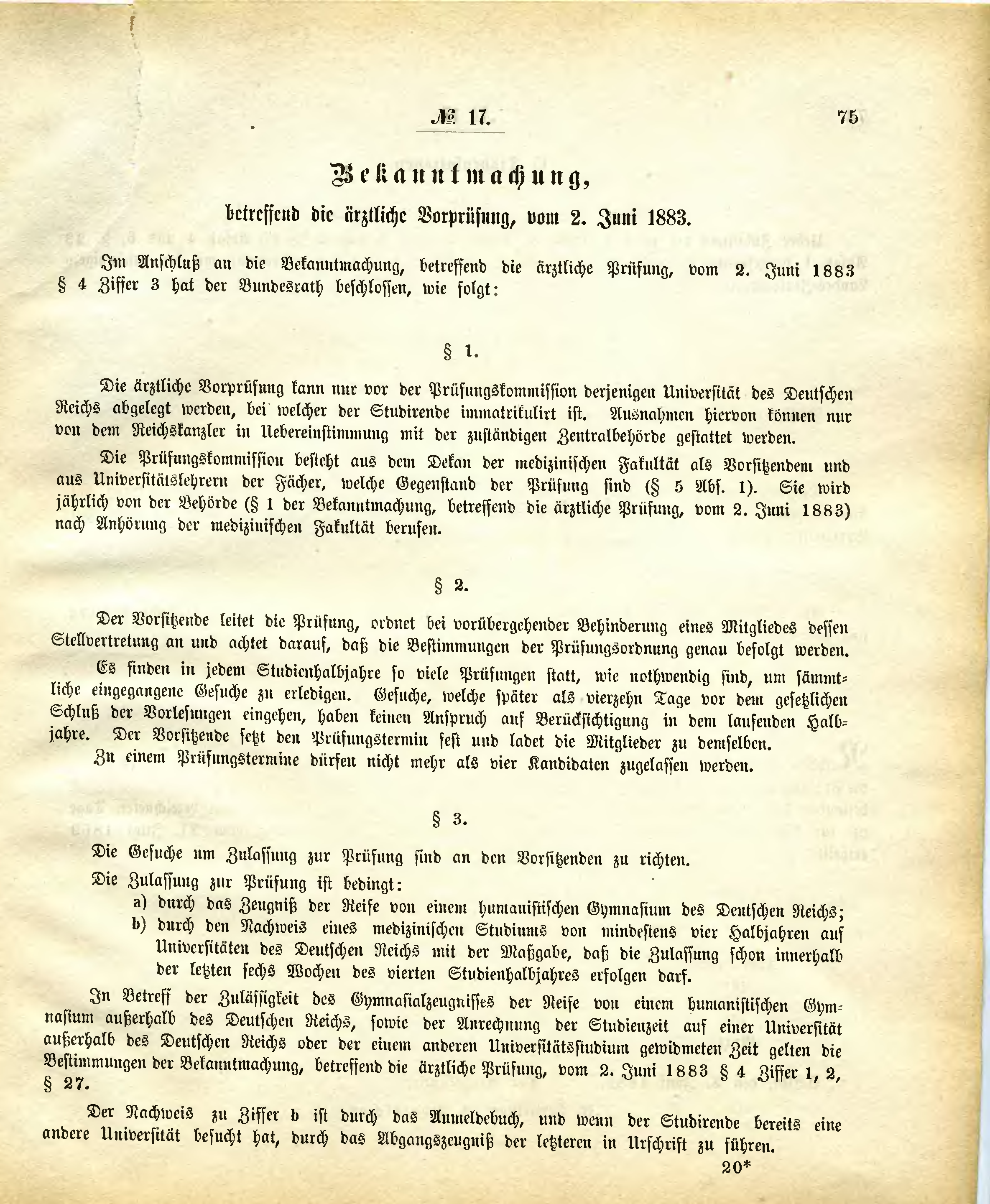 Im Anschluß an die Bekanntmachung, betreffend die ärztliche Prüfung, vom 2. Juni 1883 § 4 Ziffer 3 hat der Bundesrath beschlossen, wie folgt: