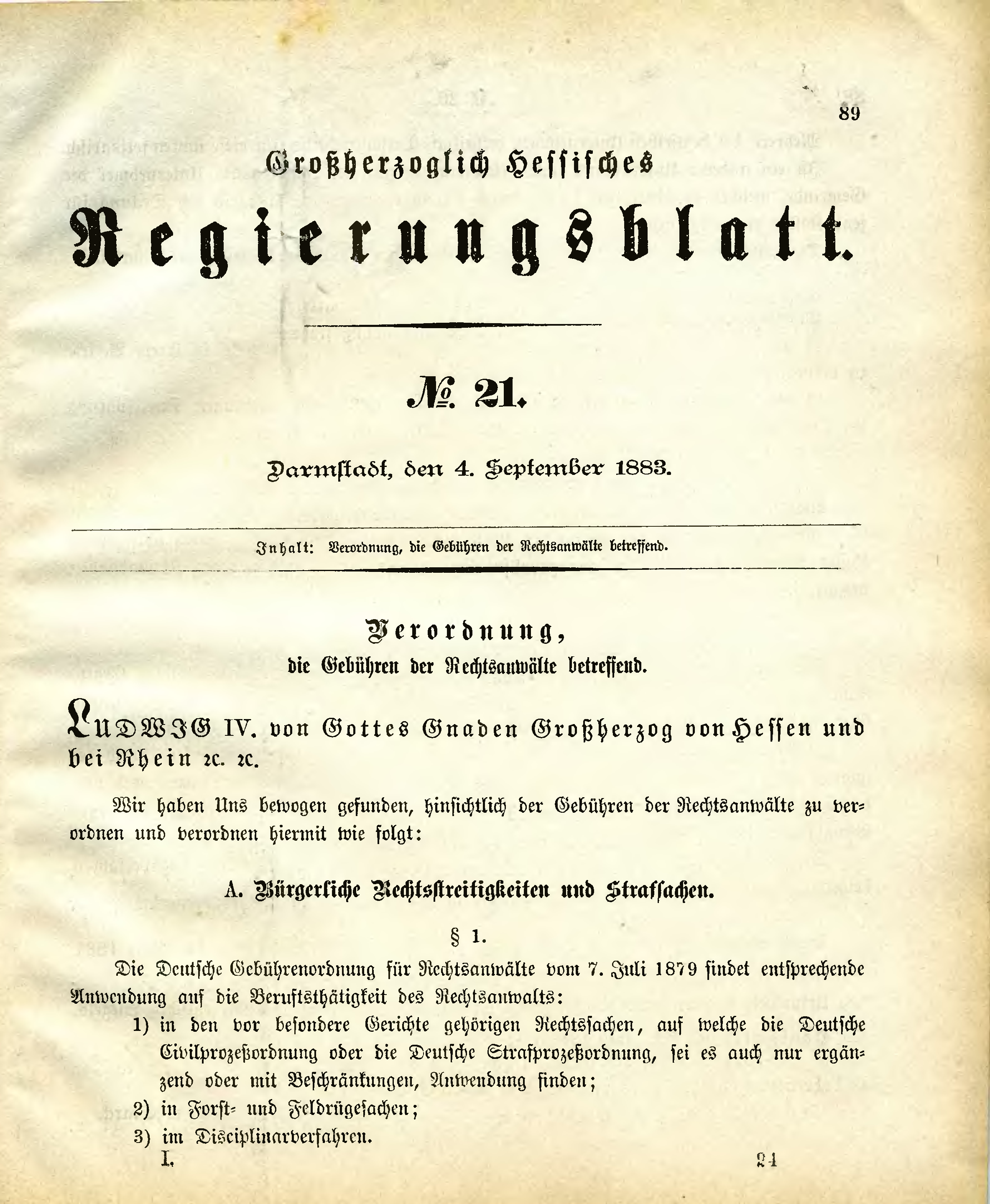Wir haben Uns bewogen gefunden, hinsichtlich der Gebühren der Rechtsanwälte zu verordnen und verordnen hiermit wie folgt: