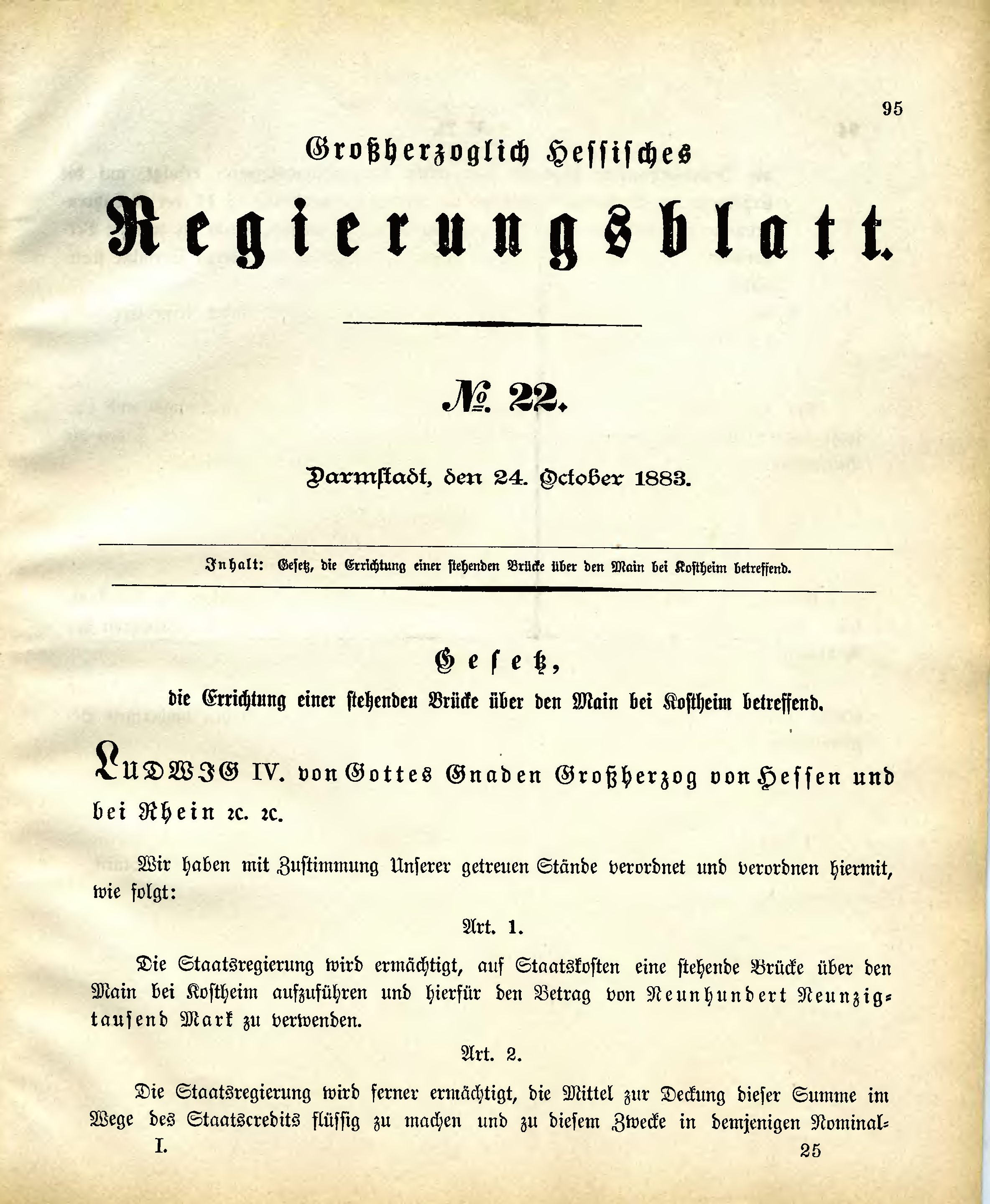 Die Staatsregierung wird ermächtigt, auf Staatskosten eine stehende Brücke über den Main bei Kostheim aufzuführen und hierfür den Betrag von Neunhundert Neunzigtausend Mark zu verwenden.