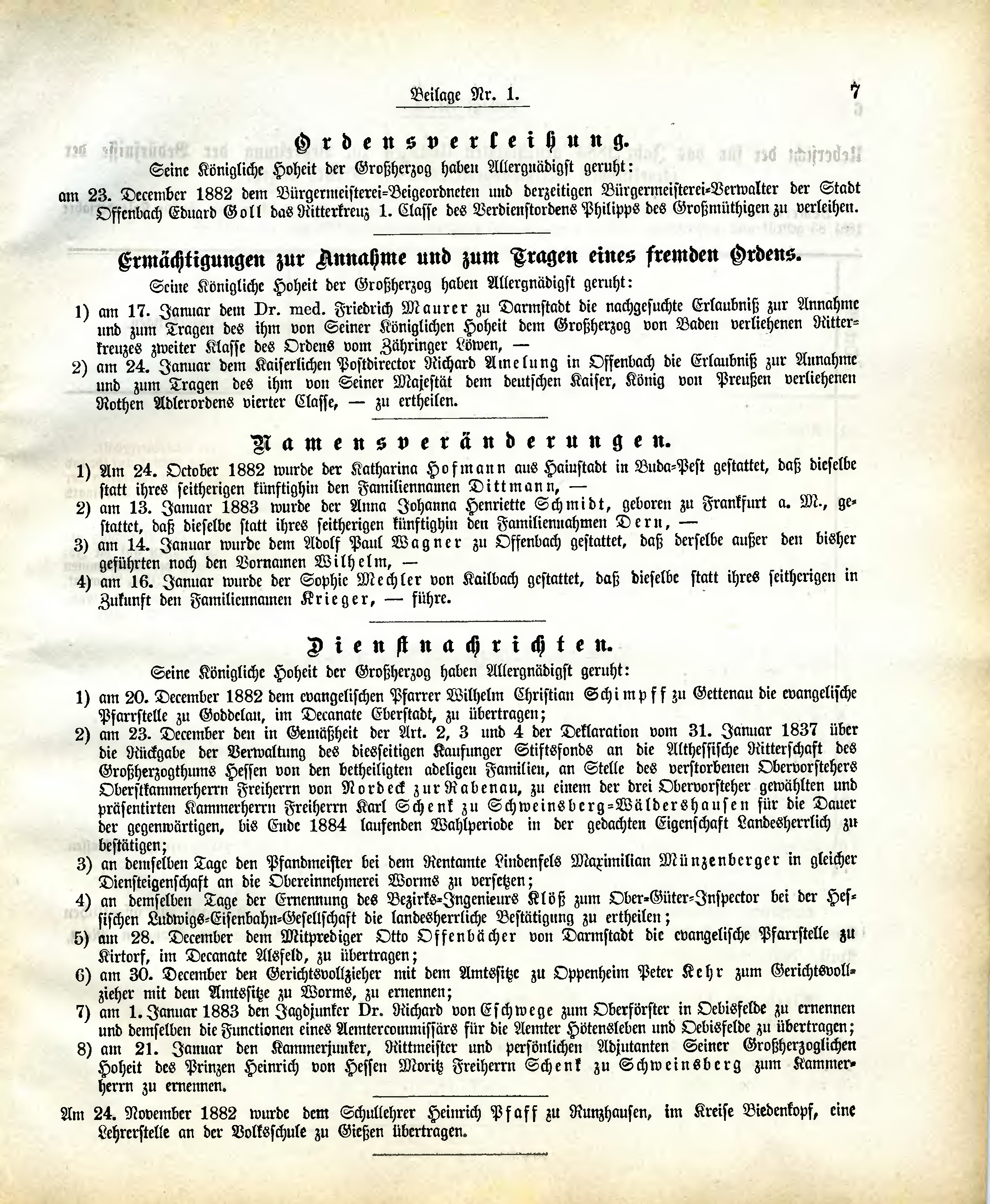 am 23. December 1882 dem Bürgermeisterei-Beigeordneten und derzeitigen Bürgermeisterei-Verwalter der Stadt Offenbach Eduard Goll das Ritterkreuz 1. Classe des Verdienstordens Philipps des Großmüthigen zu verleihen.