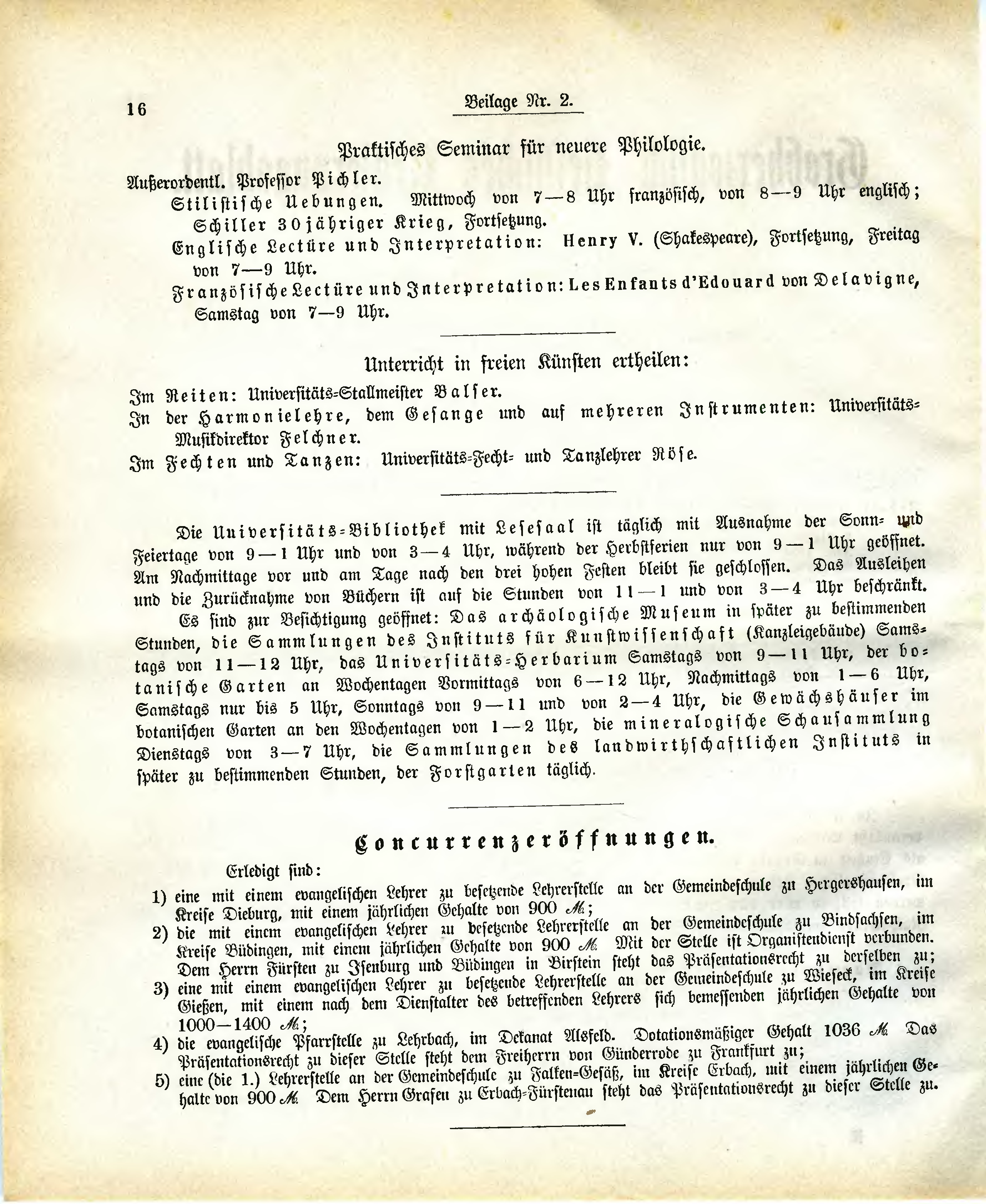 Die Universitäts-Bibliothek mit Lesesaal ist täglich mit Ausnahme der Sonn- und Feiertage von 9-1 Uhr und von 3-4 Uhr, während der Herbstferien nur von 9-1 Uhr geöffnet. Am Nachmittage vor und am Tage nach den drei hohen Festen bleibt sie geschlossen. Das Ausleihen und die Zurücknahme von Büchern ist auf die Stunden von 11-1 und von 3-4 Uhr beschränkt.