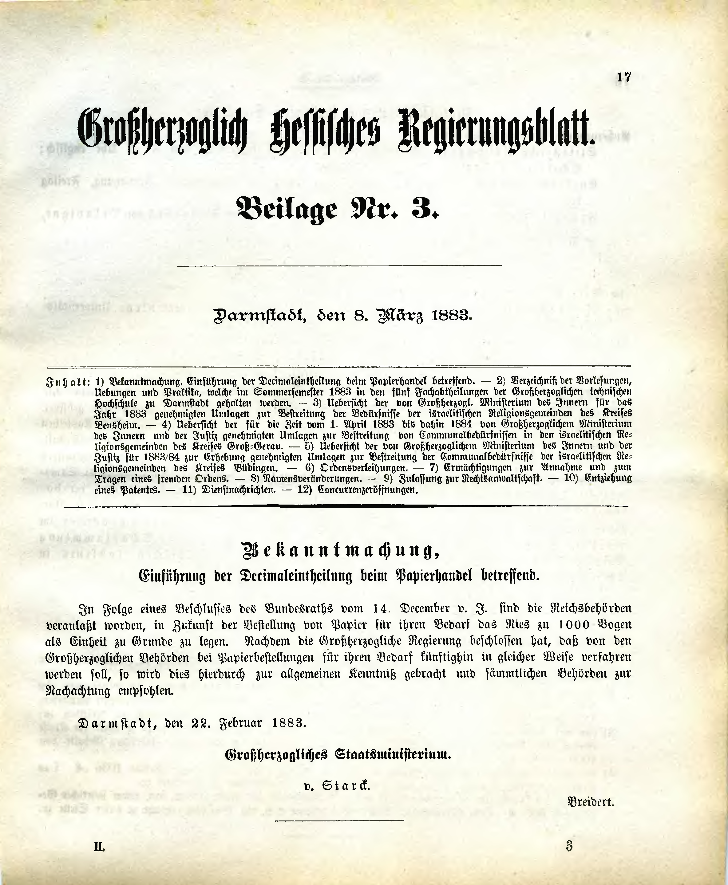 | Inhalt: | 1) Bekanntmachung, Einführung der Decimaleintheilung beim Papierhandel betreffend. - 2) Verzeichniß der Vorlesungen, Uebungen und Praktika, welche im Sommersemester 1883 in den fünf Fachabtheilungen der Großherzoglichen technischen Hochschule zu Darmstadt gehalten werden. - 3) Uebersicht der von Großherzogl. Ministerium des Innern für das Jahr 1883 genehmigten Umlagen zur Bestreitung der Bedürfnisse der israelitischen Religionsgemeinden des Kreises Bensheim. - 4) Uebersicht der für die Zeit vom 1. April 1883 bis dahin 1884 von Großherzoglichem Ministerium des Innern und der Justiz genehmigten Umlagen zur Bestreitung von Communalbedürfnissen in den israelitischen Religionsgemeinden des Kreises Groß-Gerau. - 5) Uebersicht der von Großherzoglichem Ministerium des Innern und der Justiz für 1883/84 zur Erhebung genehmigten Umlagen zur Bestreitung der Communalbedürfnisse der israelitischen Religionsgemeinden des Kreises Büdingen. - 6) Ordensverleihungen. - 7) Ermächtigungen zur Annahme und zum Tragen eines fremden Ordens. - 8) Namensveränderungen. - 9) Zulassung zur Rechtsanwaltschaft. - 10) Entziehung eines Patentes. - 11) Dienstnachrichten. - 12) Concurrenzeröffnungen. |