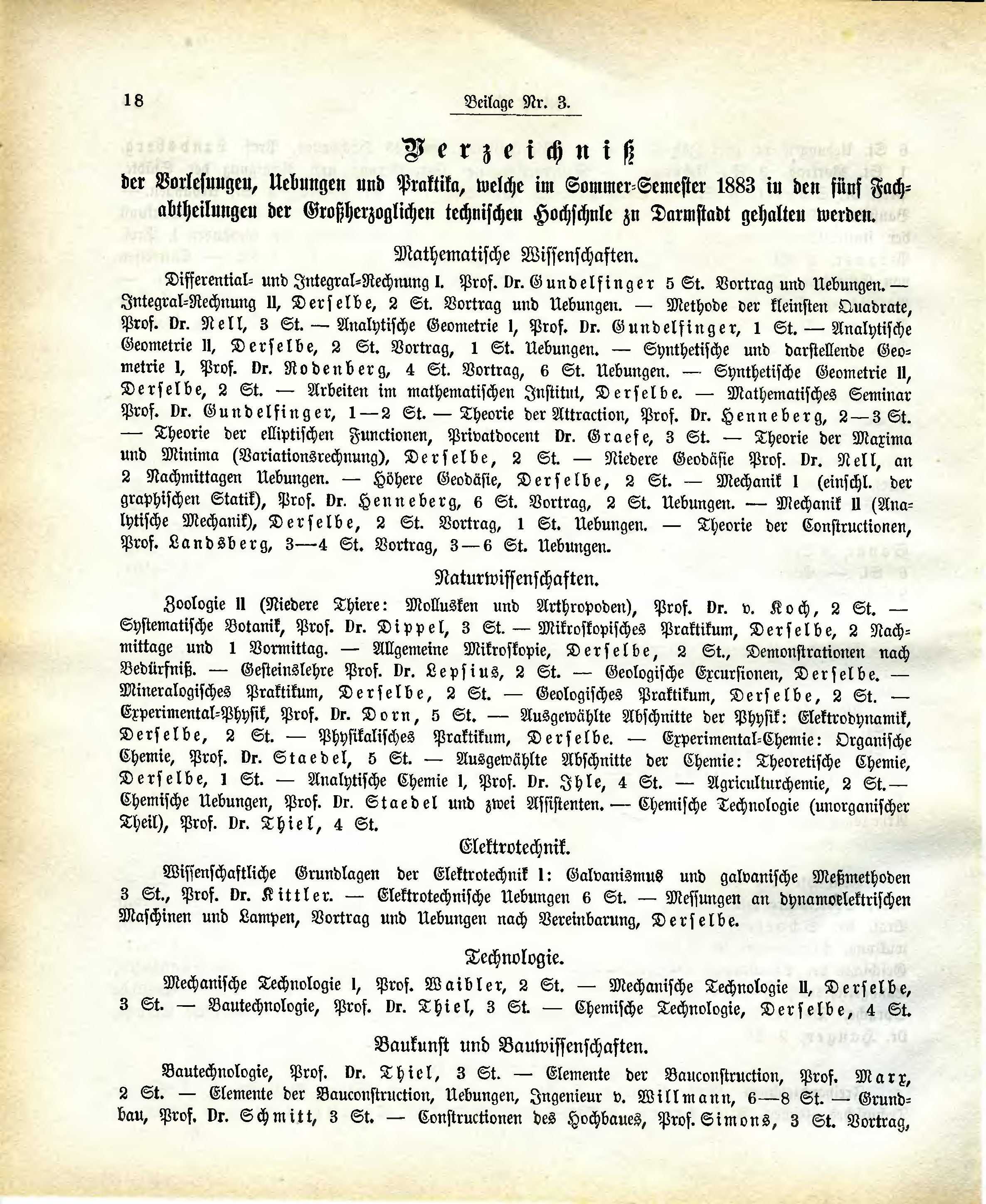 Differential- und Integral-Rechnung I. Prof. Dr. Gundelfinger 5 St. Vortrag und Uebungen. - Integral-Rechnung II, Derselbe, 2 St. Vortrag und Uebungen. - Methode der kleinsten Quadrate, Prof. Dr. Nell, 3 St. - Analytische Geometrie I, Prof. Dr. Gundelfinger, 1 St. - Analytische Geometrie II, Derselbe, 2 St. Vortrag, 1 St. Uebungen. - Synthetische und darstellende Geometrie I, Prof. Dr. Rodenberg, 4 St. Vortrag, 6 St. Uebungen. - Synthetische Geometrie II, Derselbe, 2 St. - Arbeiten im mathematischen Institut, Derselbe. - Mathematisches Seminar Prof. Dr. Gundelfinger, 1-2 St. - Theorie der Attraction, Prof. Dr. Henneberg, 2-3 St. - Theorie der elliptischen Functionen, Privatdocent Dr. Graefe, 3 St. - Theorie der Maxima und Minima (Variationsrechnung), Derselbe, 2 St. - Niedere Geodäsie Prof. Dr. Nell, an 2 Nachmittagen Uebungen. - Höhere Geodäsie, Derselbe, 2 St. - Mechanik I (einschl. der graphischen Statik), Prof. Dr. Henneberg, 6 St. Vortrag, 2 St. Uebungen. - Mechanik II (Analytische Mechanik), Derselbe, 2 St. Vortrag, 1 St. Uebungen. - Theorie der Constructionen, Prof. Landsberg, 3-4 St. Vortrag, 3-6 St. Uebungen.