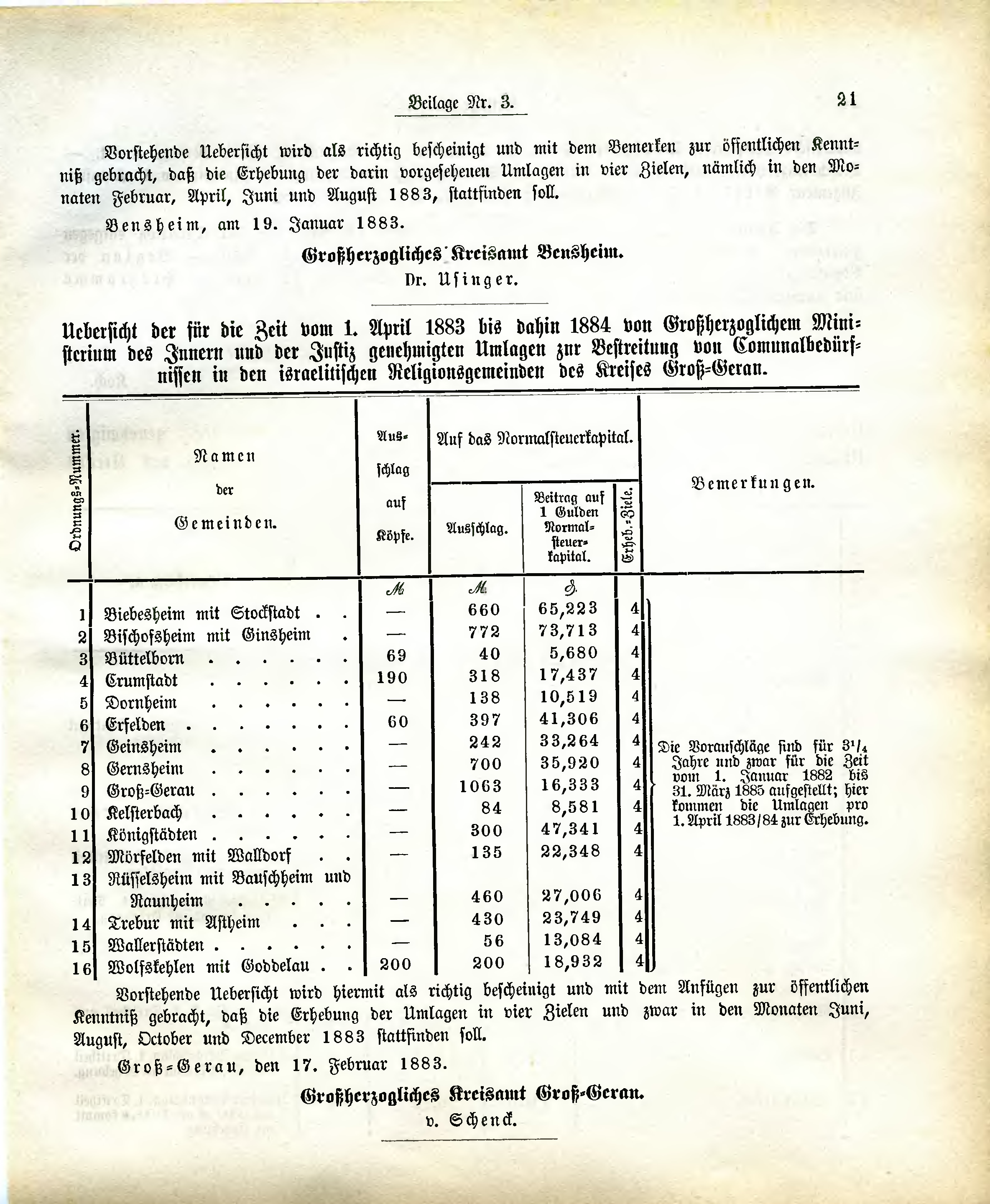 Uebersicht der für die Zeit vom 1. April 1883 bis dahin 1884 von Großherzoglichem Ministerium des Innern und der Justiz genehmigten Umlagen zur Bestreitung von Communalbedürfnissen[GWR 1] in den israelitischen Religionsgemeinden des Kreises Groß-Gerau.