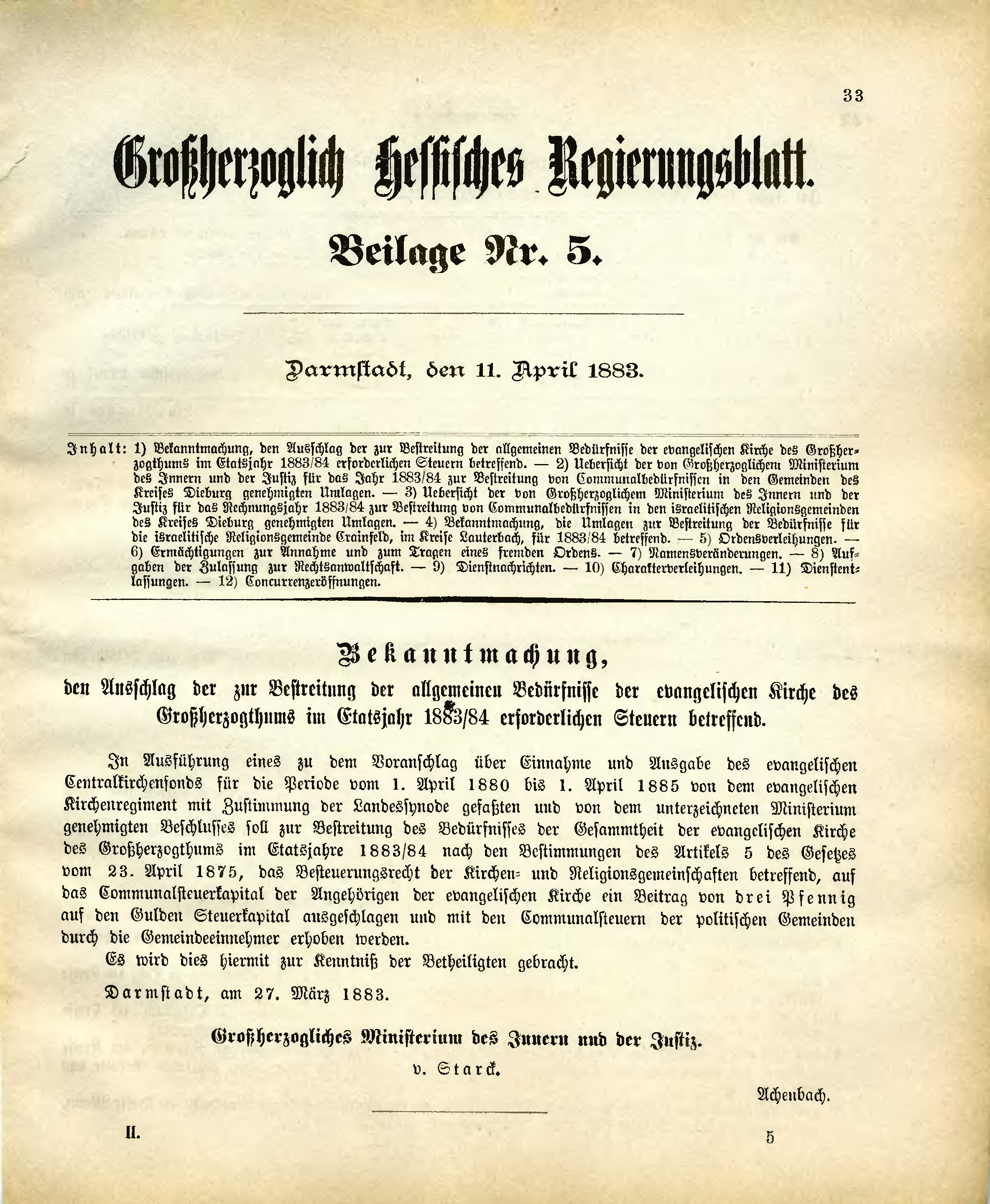 | Inhalt: | 1) Bekanntmachung, den Ausschlag der zur Bestreitung der allgemeinen Bedürfnisse der evangelischen Kirche des Großherzogthums im Etatsjahr 1883/84 erforderlichen Steuern betreffend. - 2) Uebersicht der von Großherzoglichem Ministerium des Innern und der Justiz für daß Jahr 1883/84 zur Bestreitung von Communalbedürfnissen in den Gemeinden des Kreises Dieburg genehmigten Umlagen. - 3) Uebersicht der von Großherzoglichem Ministerium des Innern und der Justiz für daß Rechnungsjahr 1883/84 zur Bestreitung von Communalbedürfnissen in den israelitischen Religionsgemeinden des Kreises Dieburg genehmigten Umlagen. - 4) Bekanntmachung, die Umlagen zur Bestreitung der Bedürfnisse für die israelitische Religionsgemeinde Crainfeld, im Kreise Lauterbach, für 1883/84 betreffend. - 5) Ordensverleihungen. - 6) Ermächtigungen zur Annahme und zum Tragen eines fremden Ordens. - 7) Namensveränderungen. - 8) Aufgaben der Zulassung zur Rechtsanwaltschaft. - 9) Dienstnachrichten. - 10) Charakterverleihungen. - 11) Dienstentlassungen. - 12) Concurrenzeröffnungen. |