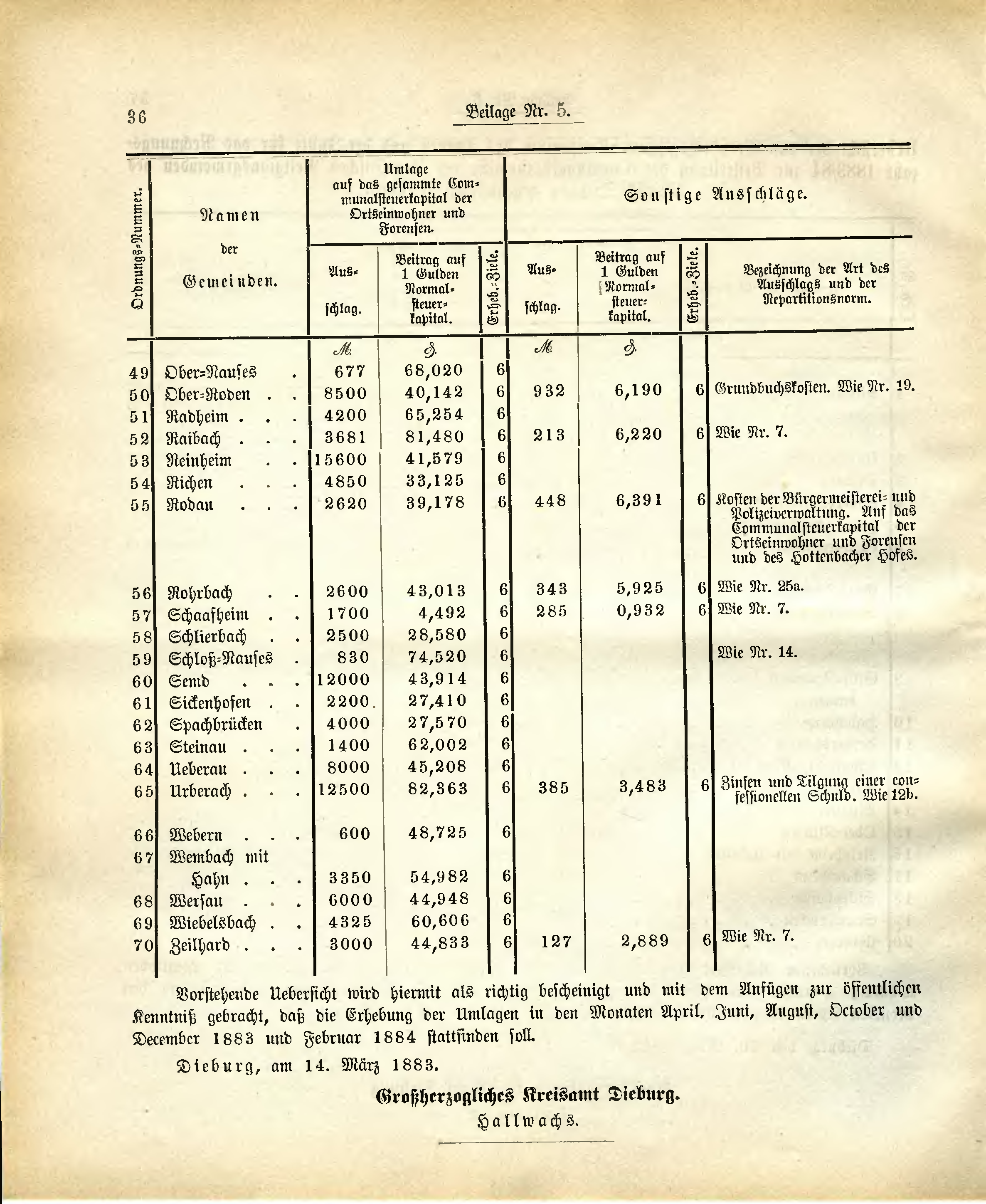 Vorstehende Uebersicht wird hiermit als richtig beischeinigt und mit dem Anfügen zur öffentlichen Kenntniß gebracht, daß die Erhebung der Umlagen in den Monaten April, Juni, August, October und December 1883 und Februar 1884 stattfinden soll.