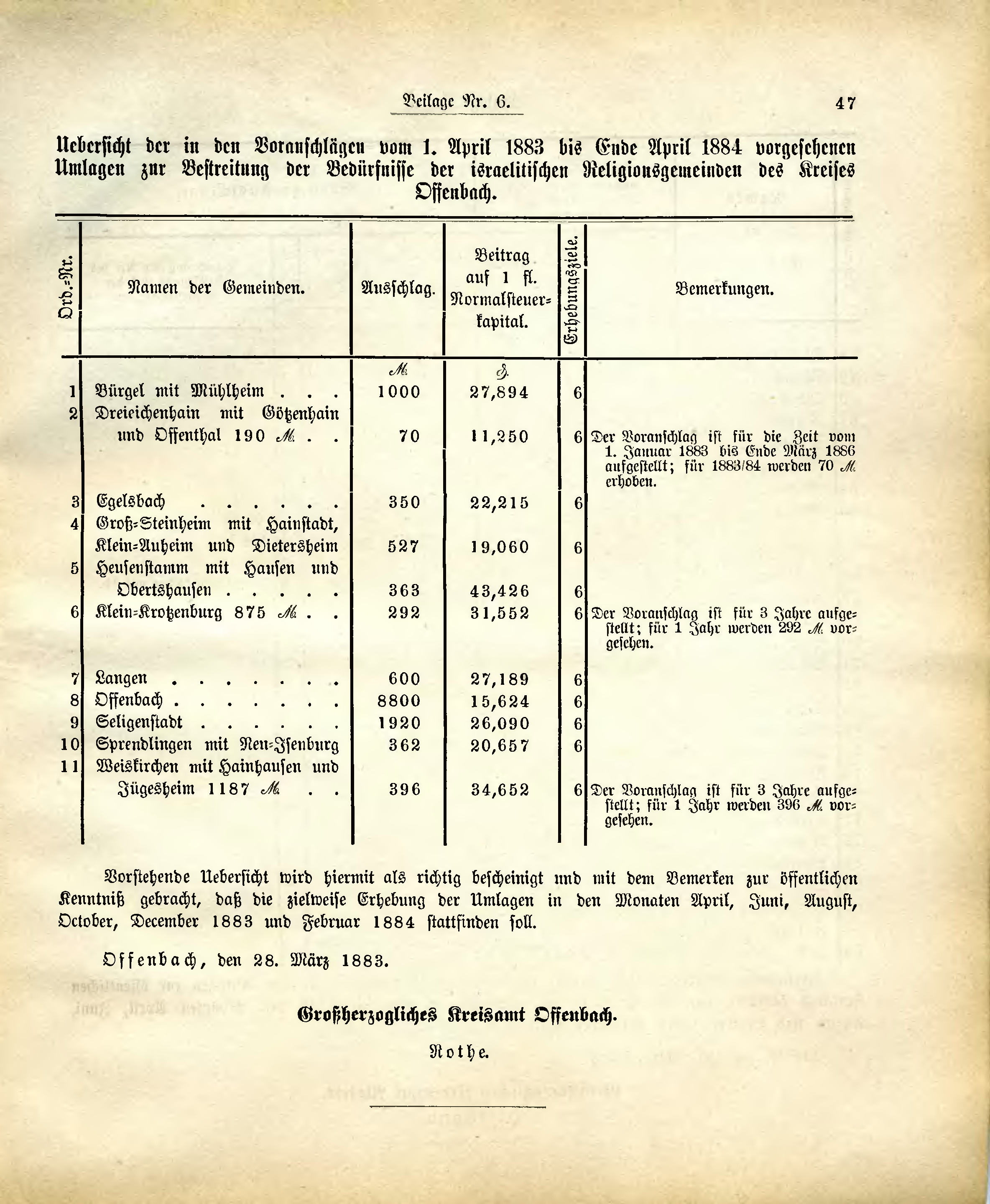 Uebersicht der in den Voranschlägen vom 1. April 1883 bis Ende April 1884 vorgesehenen Umlagen zur Bestreitung der Bedürfnisse der israelitischen Religionsgemeinden des Kreises Offenbach.