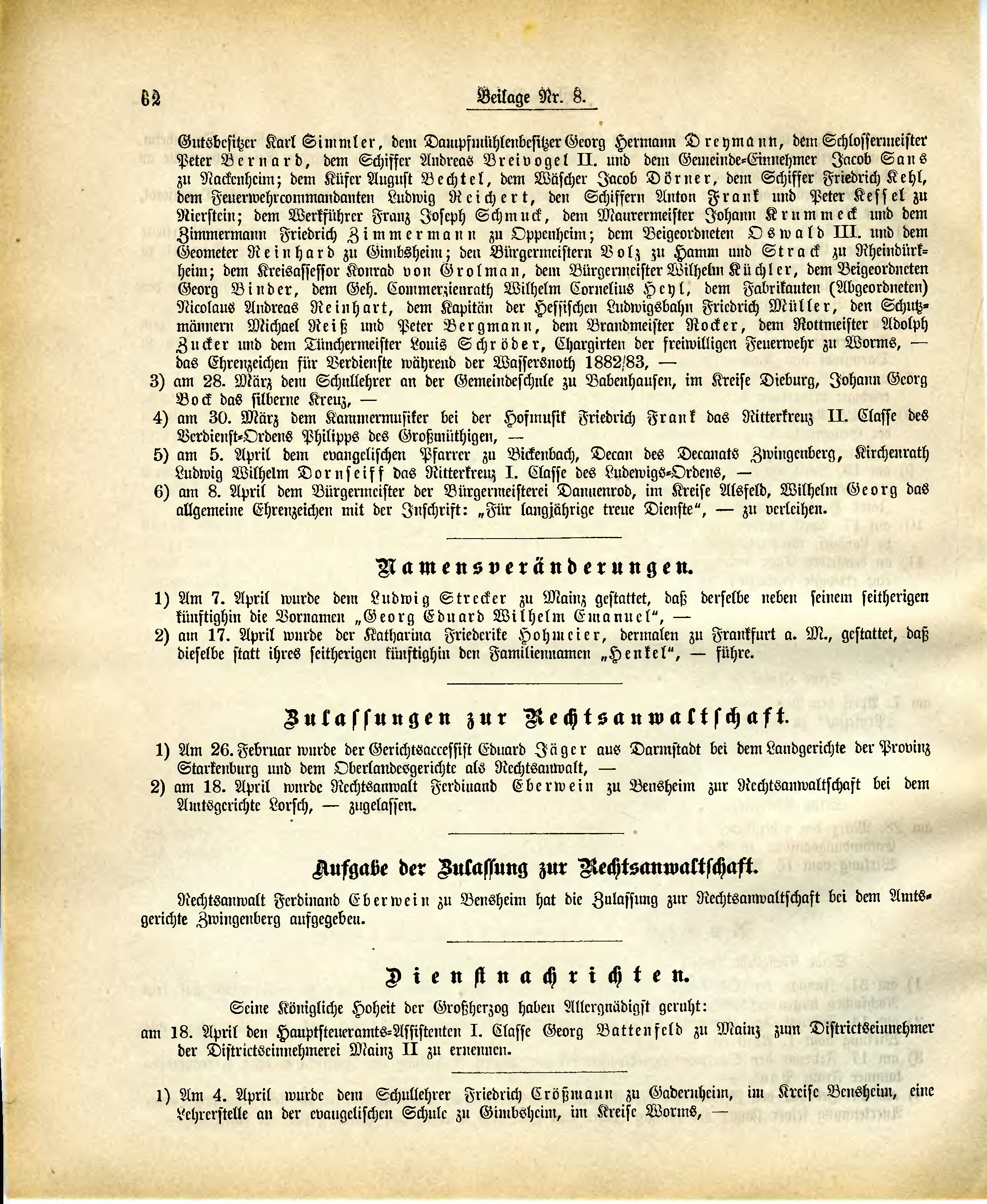 | 2) | am 18. April wurde Rechtsanwalt Ferdinand Eberwein zu Bensheim zur Rechtsanwaltschaft bei dem Amtsgerichte Lorsch, - zugelassen. |