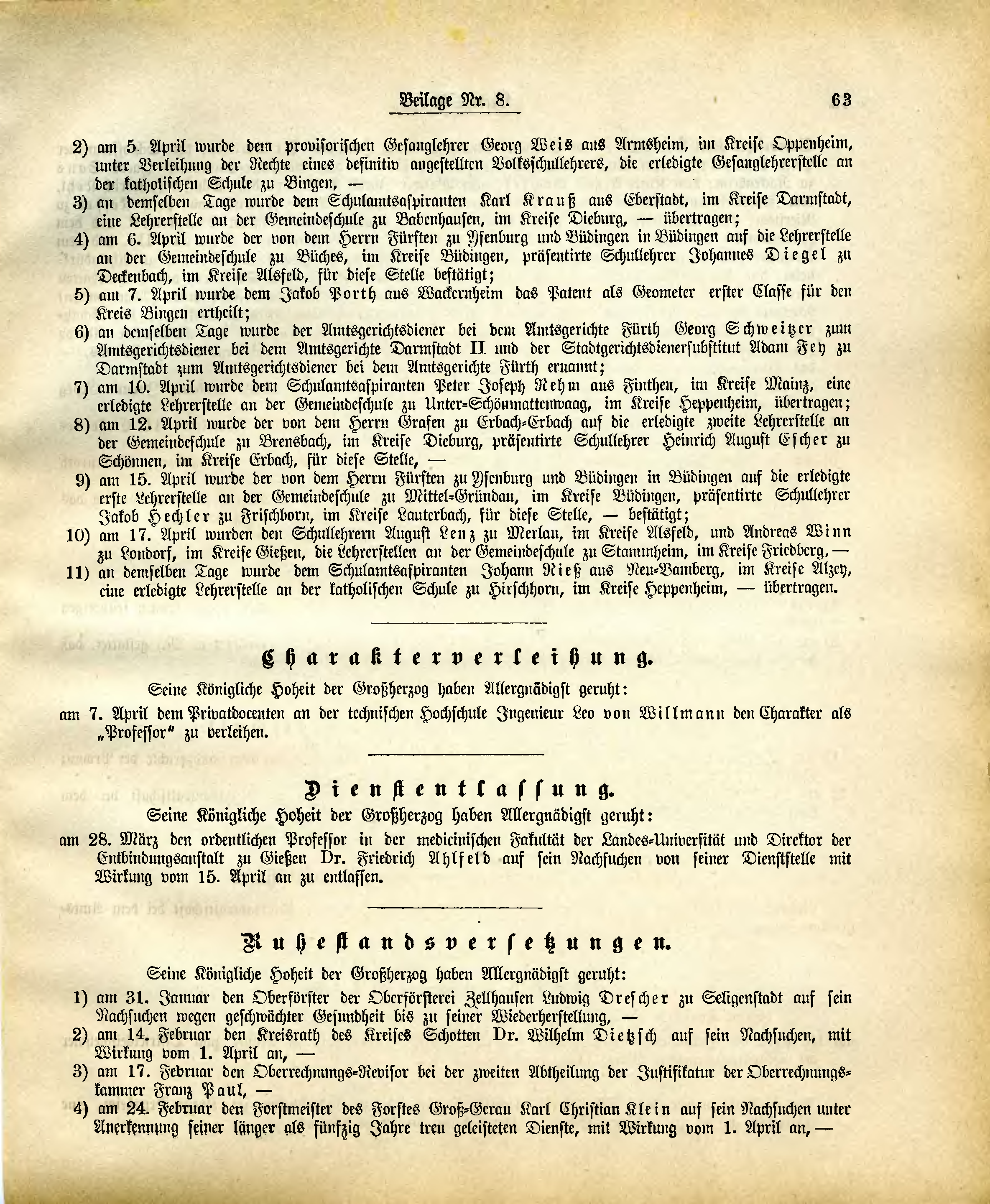 | 10) | am 17. April wurden den Schullehrern August Lenz zu Merlau, im Kreise Alsfeld, und Andreas Winn zu Londorf, im Kreise Gießen, die Lehrerstellen an der Gemeindeschule zu Stammheim, im Kreise Friedberg, - |