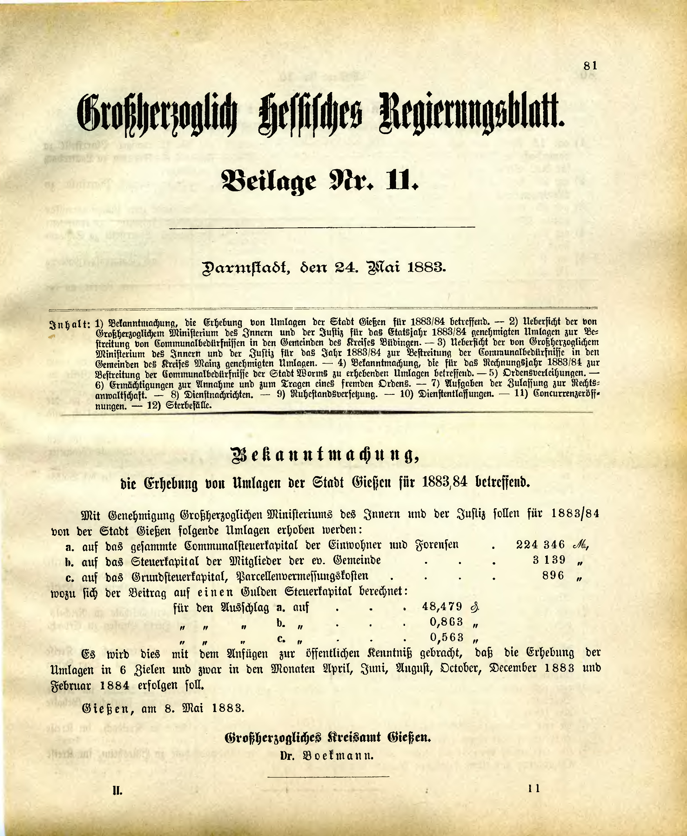 Mit Genehmigung Großherzoglichen Ministeriums des Innern und der Justiz sollen für 1883/84 von der Stadt Gießen folgende Umlagen erhoben werden: