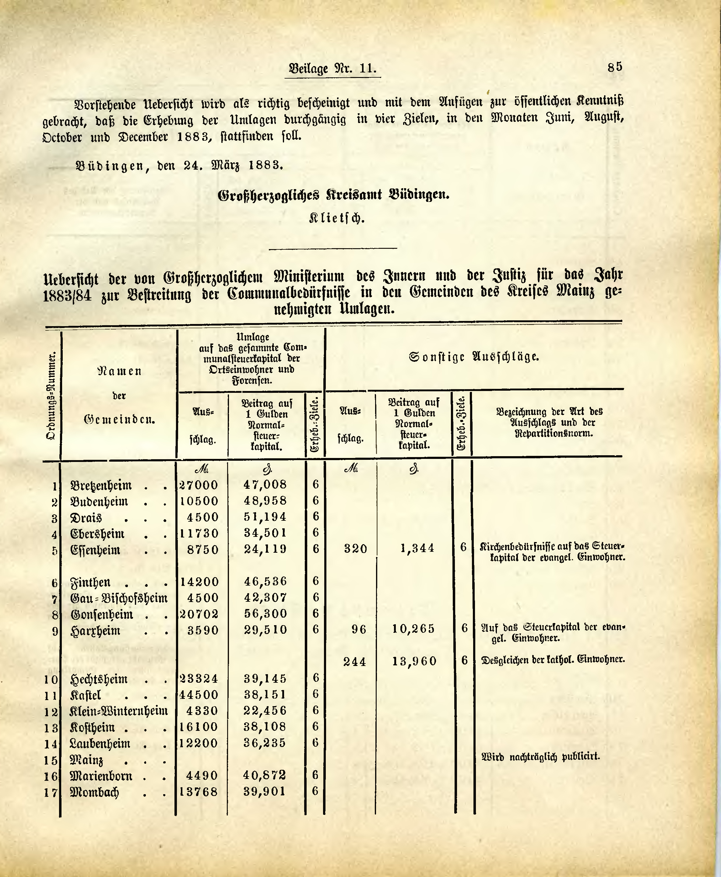 Uebersicht der von Großherzoglichem Ministerium des Innern und der Justiz für das Jahr 1883/84 zur Bestreitung der Communalbedürfnisse in den Gemeinden des Kreises Mainz genehmigten Umlagen.