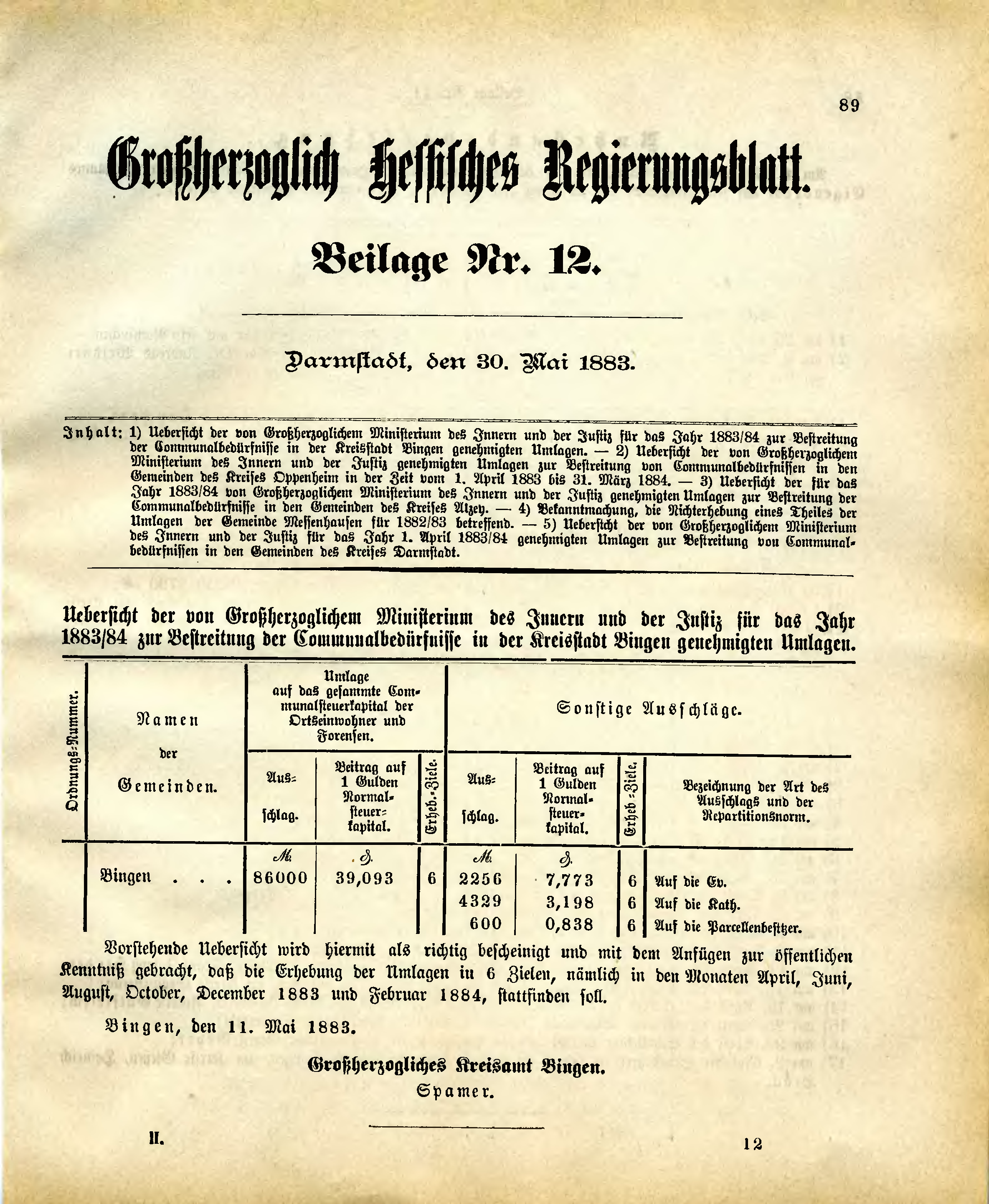 Inhalt: 1) Uebersicht der von Großherzoglichem Ministerium des Innern und der Justiz für daß Jahr 1883/84 zur Bestreitung der Communalbedürfnisse in der Kreisstadt Bingen genehmigten Umlagen. - 2) Uebersicht der von Großherzoglichem Ministerium des Innern und der Justiz genehmigten Umlagen zur Bestreitung von Communalbedürfnissen in den Gemeinden des Kreises Oppenheim in der Zeit vom 1. April 1883 bis 31. März 1884. - 3) Uebersicht der für das Jahr 1883/84 von Großherzoglichem Ministerium des Innern und der Justiz genehmigten Umlagen zur Bestreitung der Communalbedürfnisse in den Gemeinden des Kreises Alzey. - 4) Bekanntmachung, die Nichterhebung eines Theiles der Umlagen der Gemeinde Messenhausen für 1882/83 betreffend. - 5) Uebersicht der von Großherzoglichem Ministerium des Innern und der Justiz für daß Jahr 1. April 1883/84 genehmigten Umlagen zur Bestreitung von Communalbedürfnissen in den Gemeinden des Kreises Darmstadt.