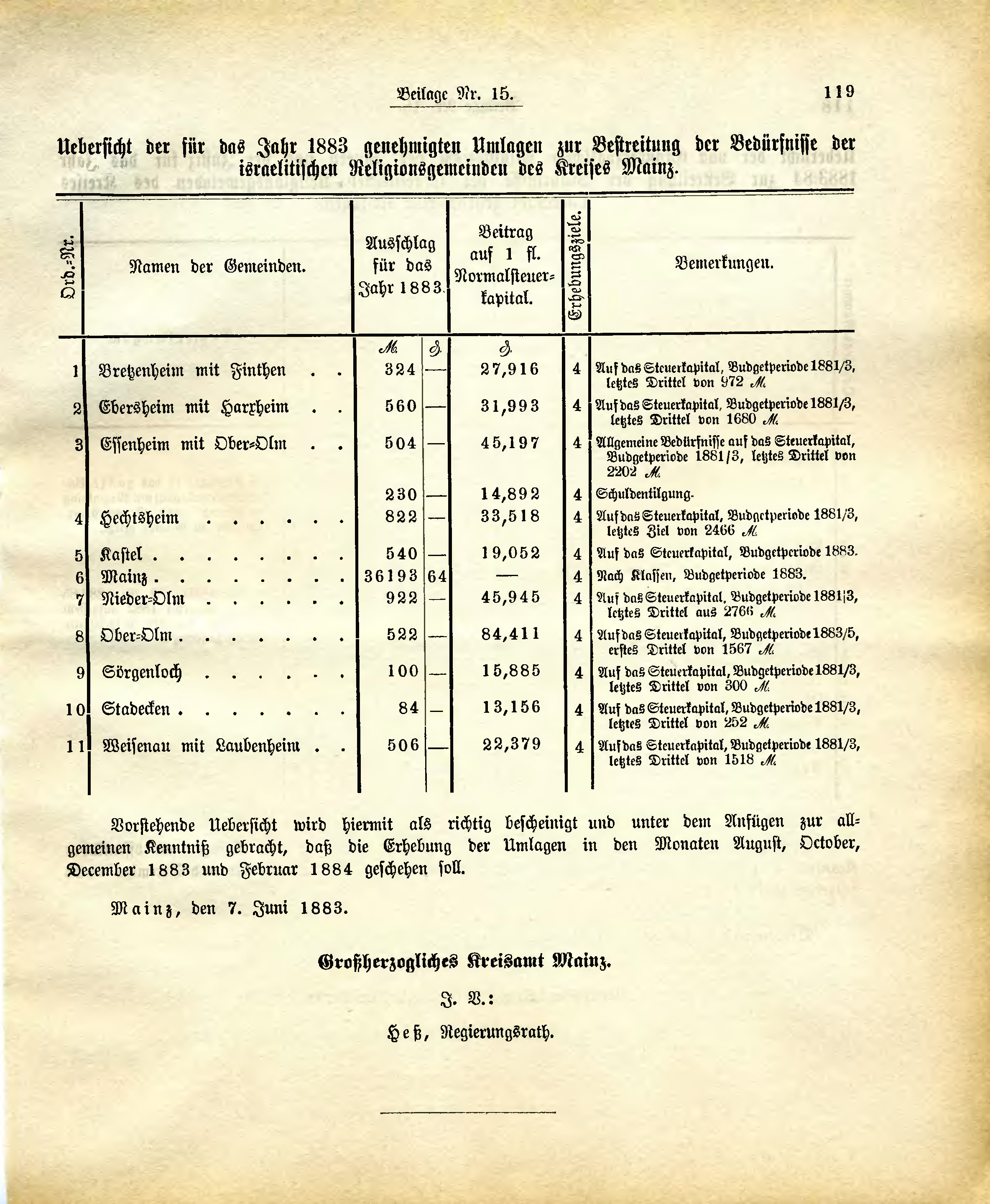 Uebersicht der für das Jahr 1883 genehmigten Umlagen zur Bestreitung der Bedürfnisse der israelitischen Religionsgemeinden des Kreises Mainz.