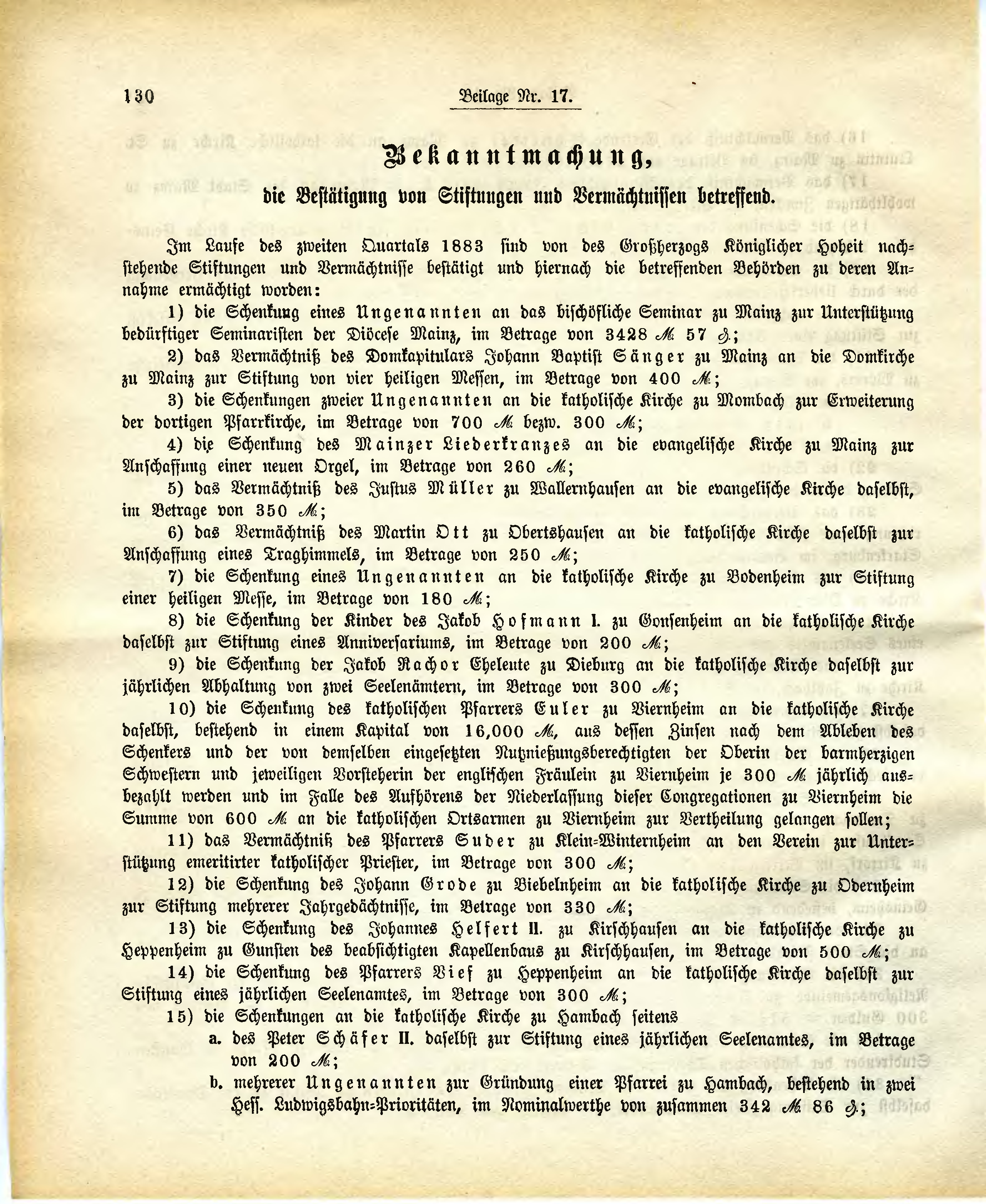 1) die Schenkung eines Ungenannten an das bischöfliche Seminar zu Mainz zur Unterstützung bedürftiger Seminaristen der Diöcese Mainz, im Betrage von 3428