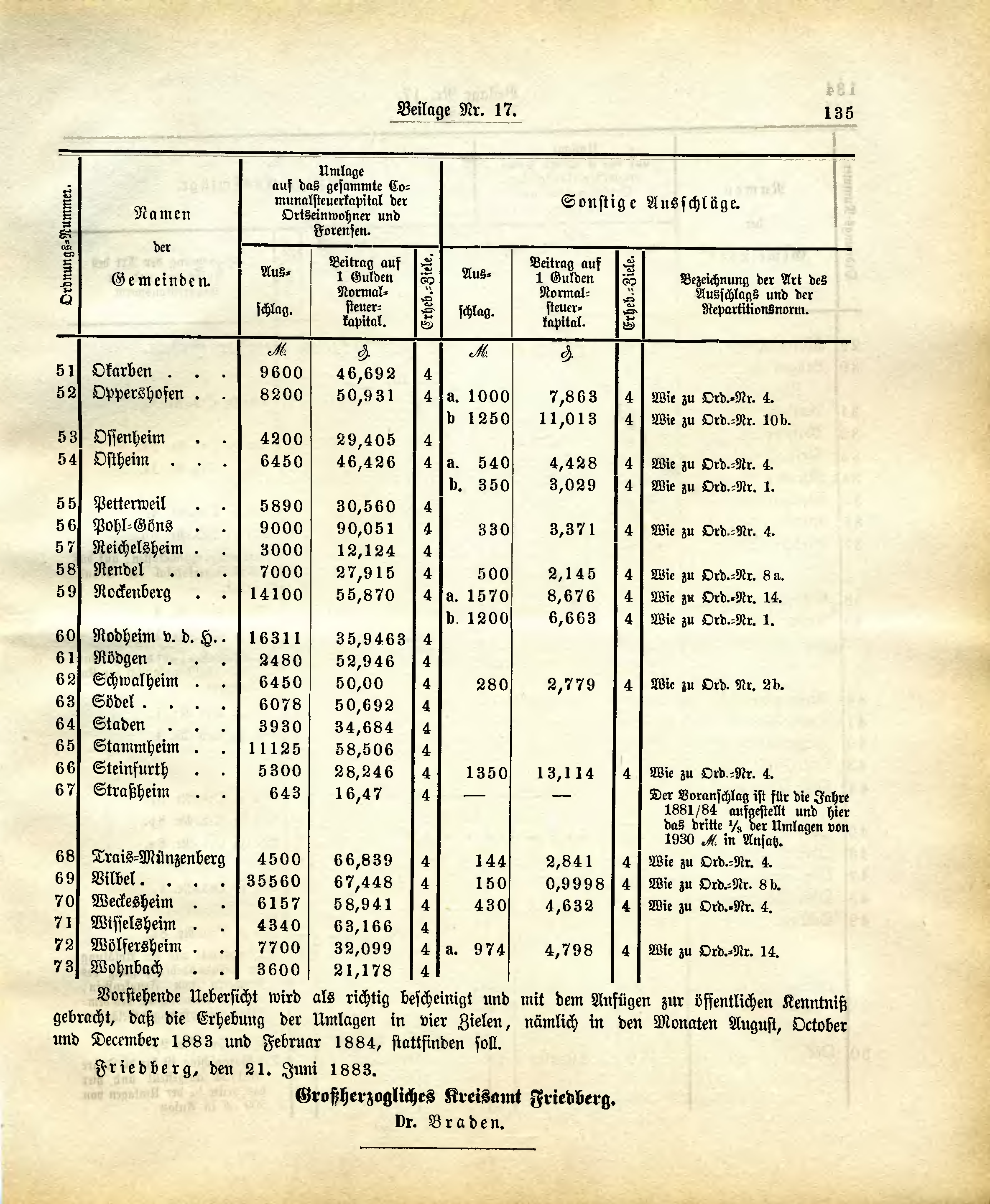 Vorstehende Uebersicht wird als richtig bescheinigt und mit dem Anfügen zur öffentlichen Kenntniß gebracht, daß die Erhebung der Umlagen in vier Zielen, nämlich in den Monaten August, October und December 1883 und Februar 1884, stattfinden soll.