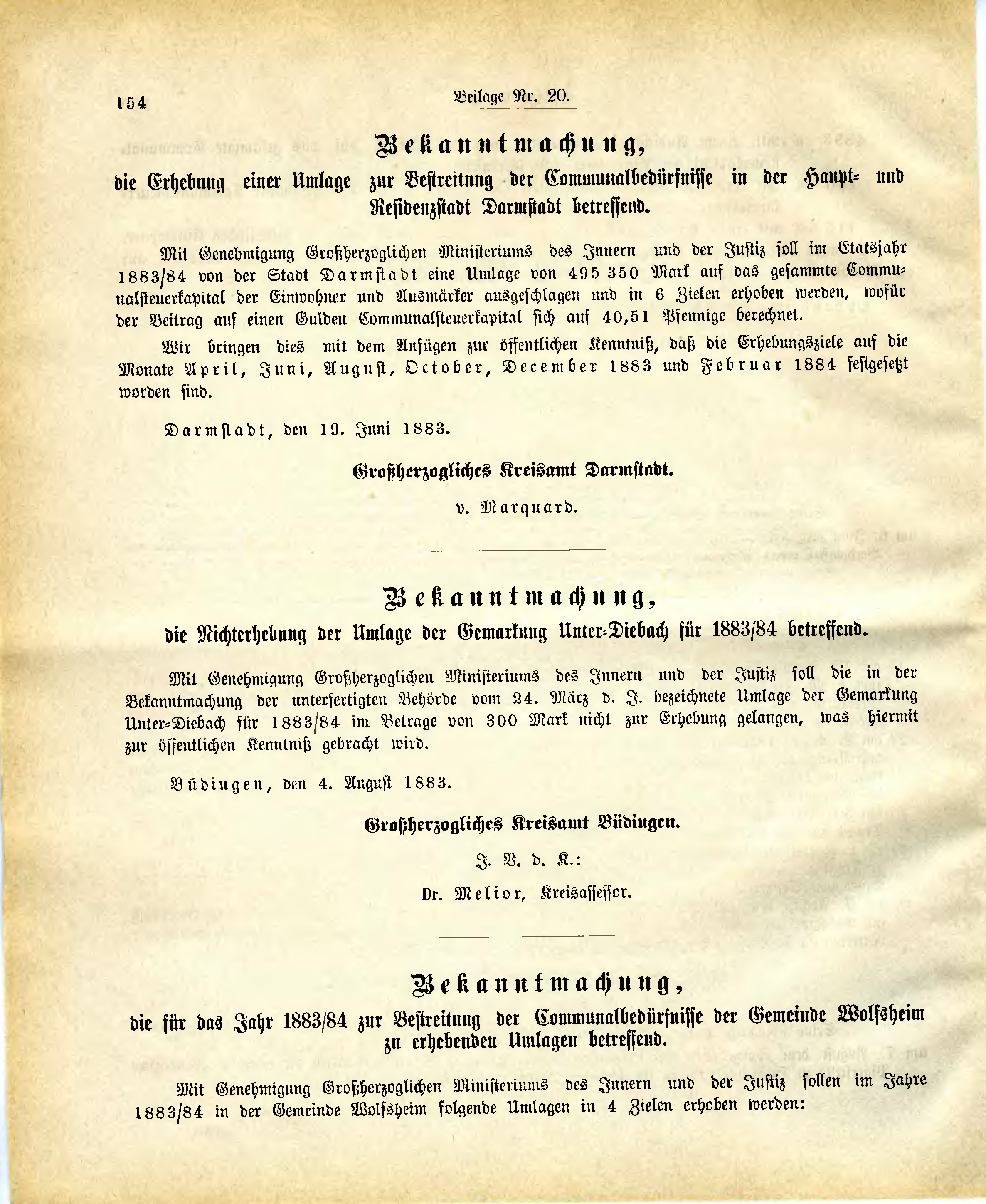 Mit Genehmigung Großherzoglichen Ministeriums des Innern und der Justiz soll im Etatsjahr 1883/84 von der Stadt Darmstadt eine Umlage von 495 350 Mark auf das gesammte Communalsteuerkapital der Einwohner und Ausmärker ausgeschlagen und in 6 Zielen erhoben werden, wofür der Beitrag auf einen Gulden Communalsteuerkapital sich auf 40,51 Pfennige berechnet.