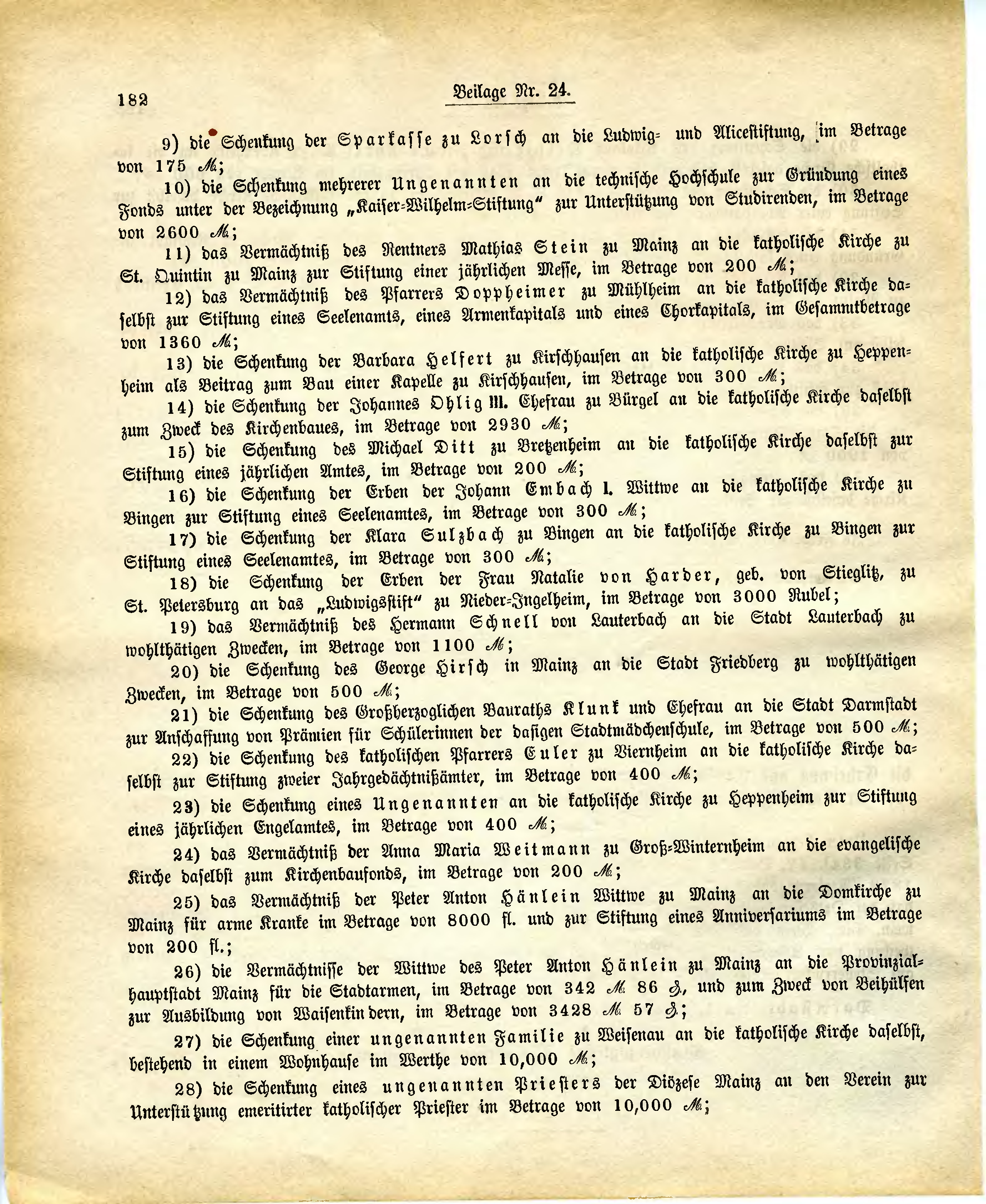 28) die Schenkung eines ungenannten Priesters der Diözese Mainz an den Verein zur Unterstützung emeritirter katholischer Priester im Betrage von 10,000