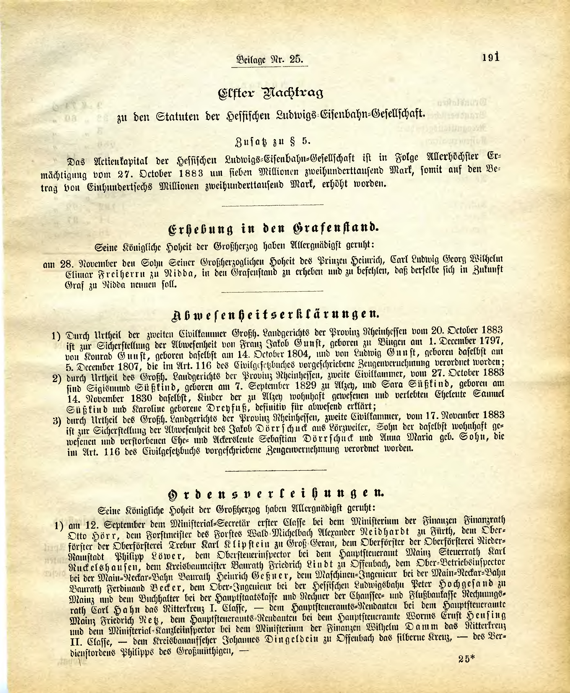 Das Actienkapital der Hessischen Ludwigs-Eisenbahn-Gesellschaft ist in Folge Allerhöchster Ermächtigung vom 27. October 1883 um sieben Millionen zweihunderttausend Mark, somit auf den Betrag von Einhundertsechs Millionen zweihunderttausend Mark, erhöht worden.