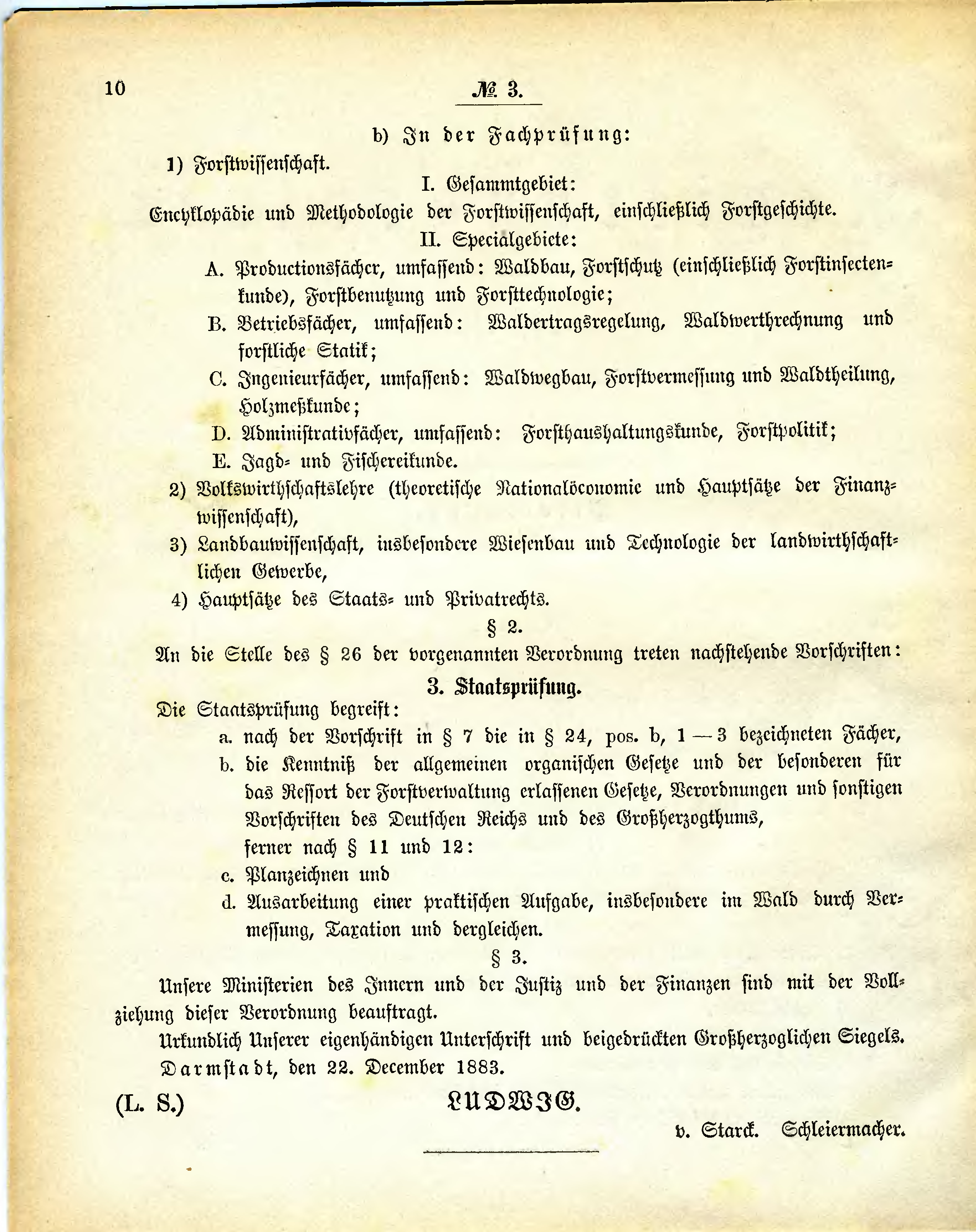 | b. die Kenntniß der allgemeinen organischen Gesetze und der besonderen für das Ressort der Forstverwaltung erlassenen Gesetze, Verordnungen und sonstigen Vorschriften des Deutschen Reichs und des Großherzogthums, ferner nach § 11 und 12: | ||