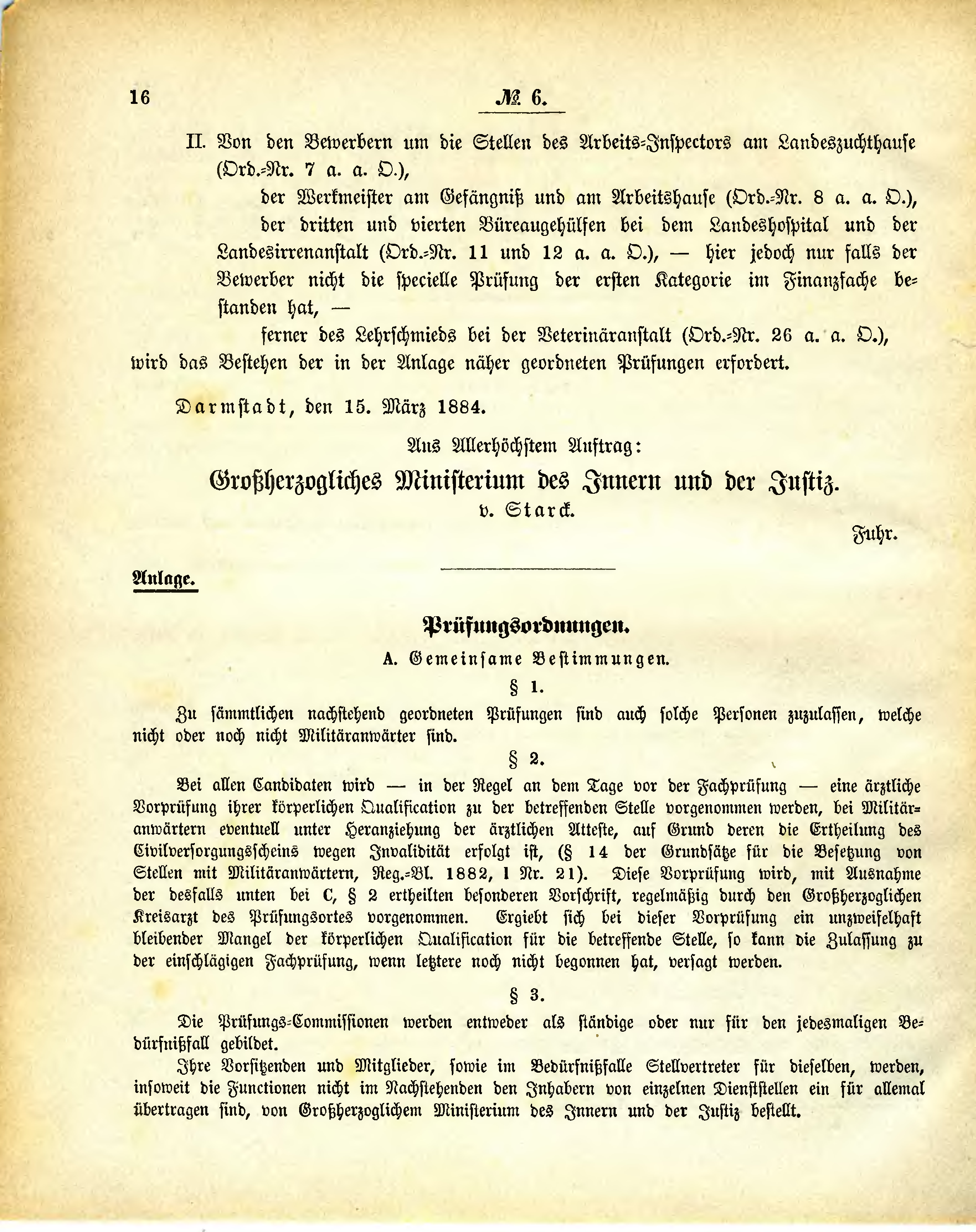 Bei allen Candidaten wird - in der Regel an dem Tage vor der Fachprüfung - eine ärztliche Vorprüfung ihrer körperlichen Qualification zu der betreffenden Stelle vorgenommen werden, bei Militäranwärtern eventuell unter Heranziehung der ärztlichen Atteste, auf Grund deren die Ertheilung des Civilversorgungsscheins wegen Invalidität erfolgt ist, (§ 14 der Grundsätze für die Besetzung von Stellen mit Militäranwärtern, Reg.-Bl. 1882, I Nr. 21). Diese Vorprüfung wird, mit Ausnahme der desfalls unten bei C, § 2 ertheilten besonderen Vorschrift, regelmäßig durch den Großherzoglichen Kreisarzt des Prüfungsortes vorgenommen. Ergiebt sich bei dieser Vorprüfung ein unzweifelhaft bleibender Mangel der körperlichen Qualification für die betreffende Stelle, so kann die Zulassung zu der einschlägigen Fachprüfung, wenn letztere noch nicht begonnen hat, versagt werden.