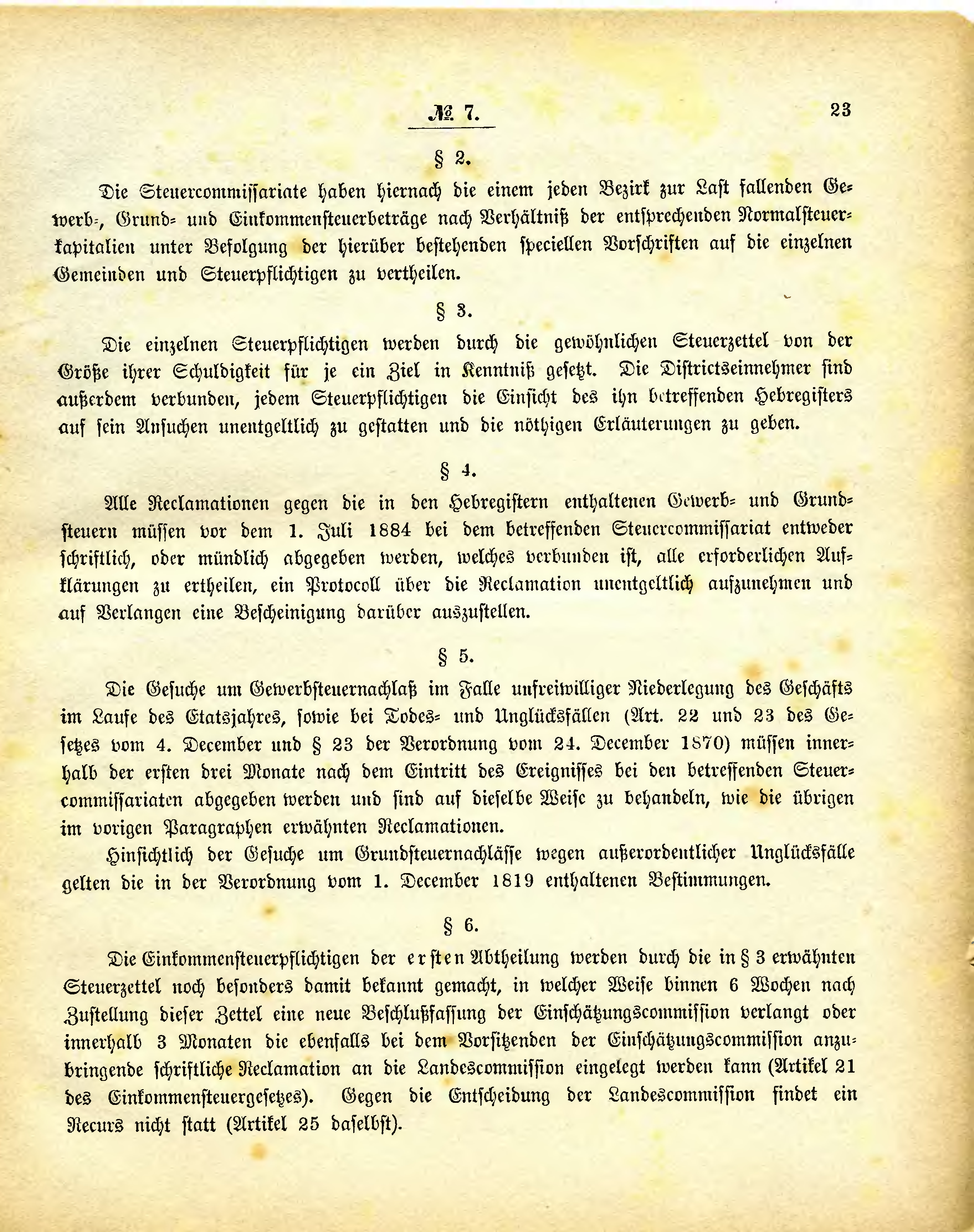 Alle Reclamationen gegen die in den Hebregistern enthaltenen Gewerb- und Grundsteuern müssen vor dem 1. Juli 1884 bei dem betreffenden Steuercommissariat entweder schriftlich, oder mündlich abgegeben werden, welches verbunden ist, alle erforderlichen Aufklärungen zu ertheilen, ein Protocoll über die Reclamation unentgeltlich aufzunehmen und auf Verlangen eine Bescheinigung darüber auszustellen.