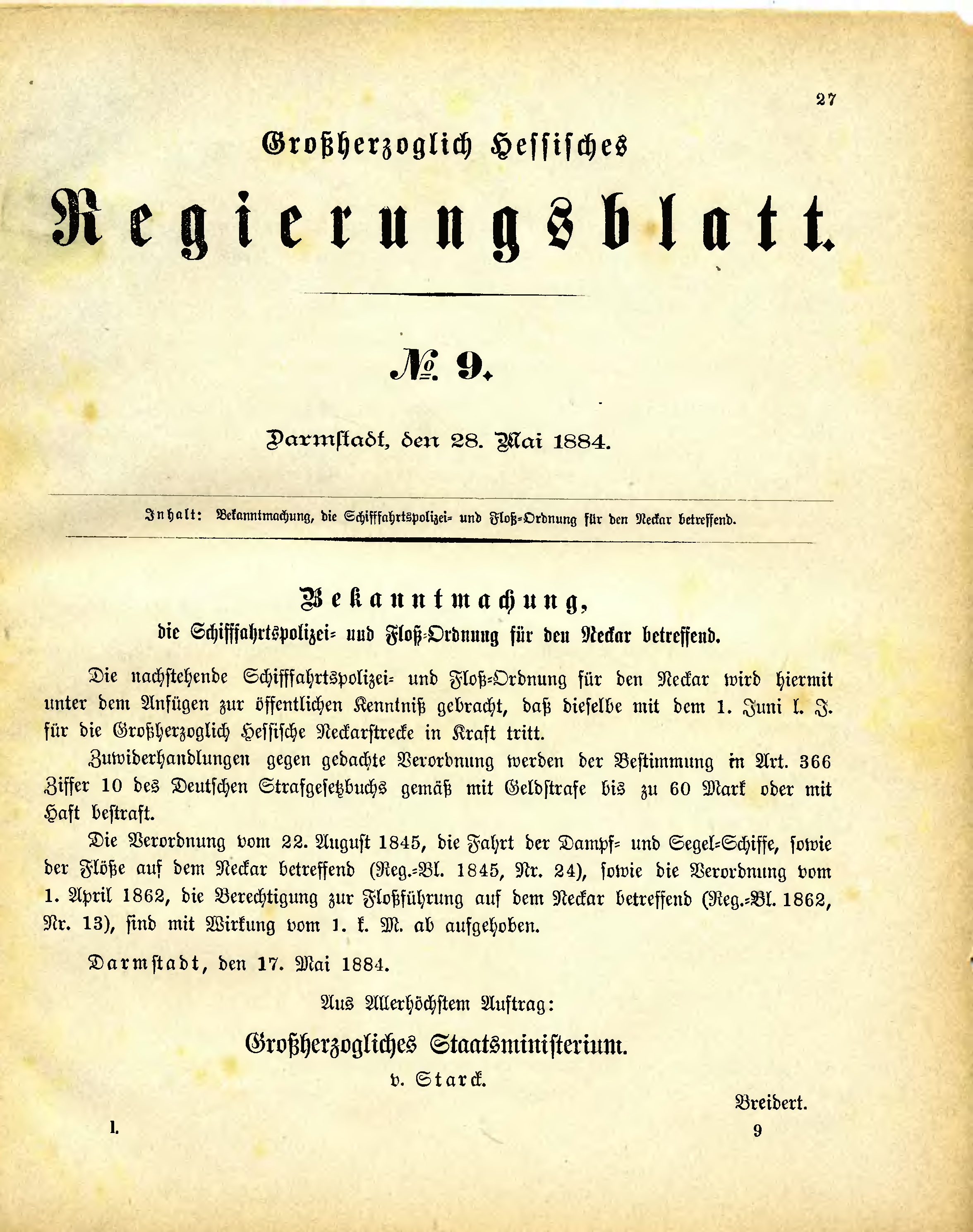 Inhalt: Bekanntmachung, die Schifffahrtspolizei- und Floß-Ordnung für den Neckar betreffend.