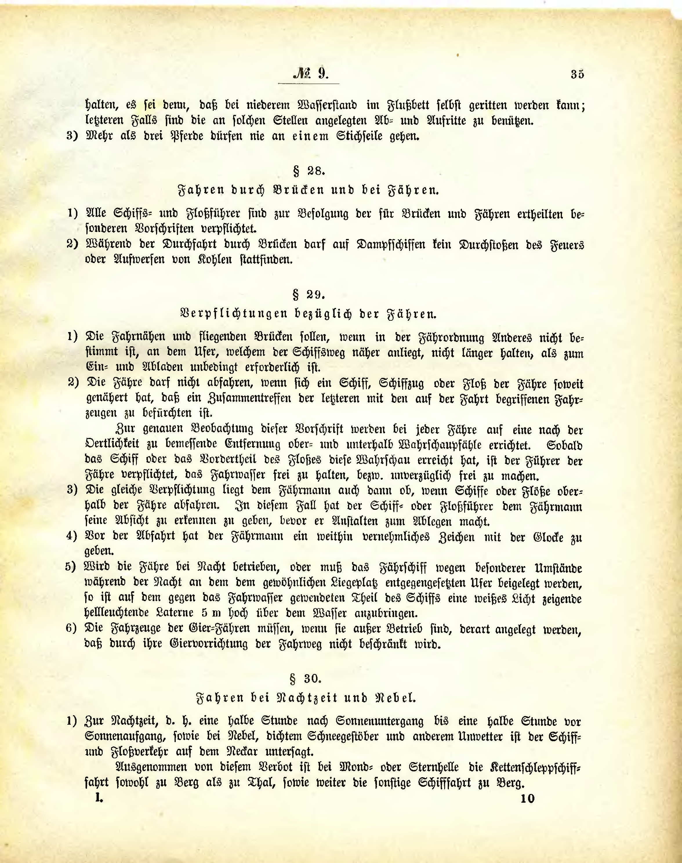 | 1) | Zur Nachtzeit, d. h. eine halbe Stunde nach Sonnenuntergang bis eine halbe Stunde vor Sonnenaufgang, sowie bei Nebel, dichtem Schneegestöber und anderem Unwetter ist der Schiff- und Floßverkehr auf dem Neckar untersagt. Ausgenommen von diesem Verbot ist bei Mond- oder Sternhelle die Kettenschleppschifffahrt sowohl zu Berg als zu Thal, sowie weiter die sonstige Schifffahrt zu Berg. |