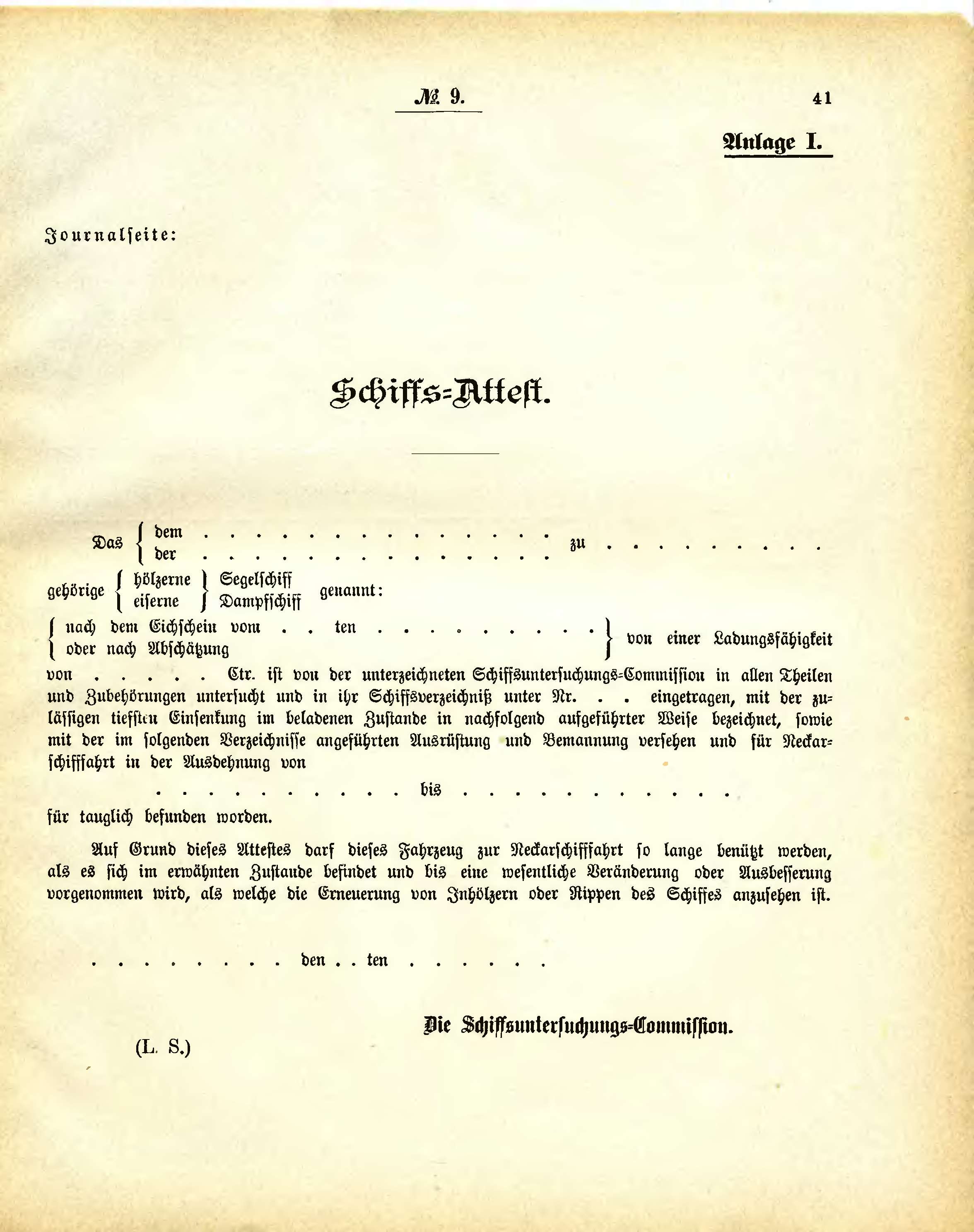 von ..... Ctr. ist von der unterzeichneten Schiffsuntersuchungs-Commission in allen Theilen und Zubehörungen untersucht und in ihr Schiffsverzeichniß unter Nr. .. eingetragen, mit der zulässigen tiefsten Einsenkung im beladenen Zustande in nachfolgend aufgeführter Weise bezeichnet, sowie mit der im folgenden Verzeichnisse angeführten Ausrüstung und Bemannung versehen und für Neckarschifffahrt in der Ausdehnung von