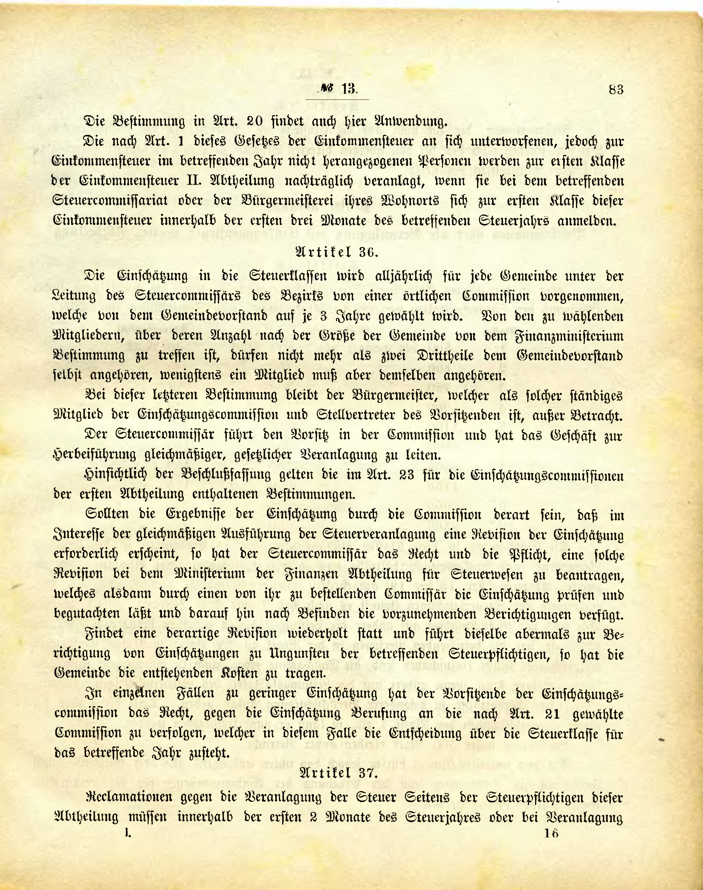 In einzelnen Fällen zu geringer Einschätzung hat der Vorsitzende der Einschätzungscommission das Recht, gegen die Einschätzung Berufung an die nach Art. 21 gewählte Commission zu verfolgen, welcher in diesem Falle die Entscheidung über die Steuerklasse für das betreffende Jahr zusteht.