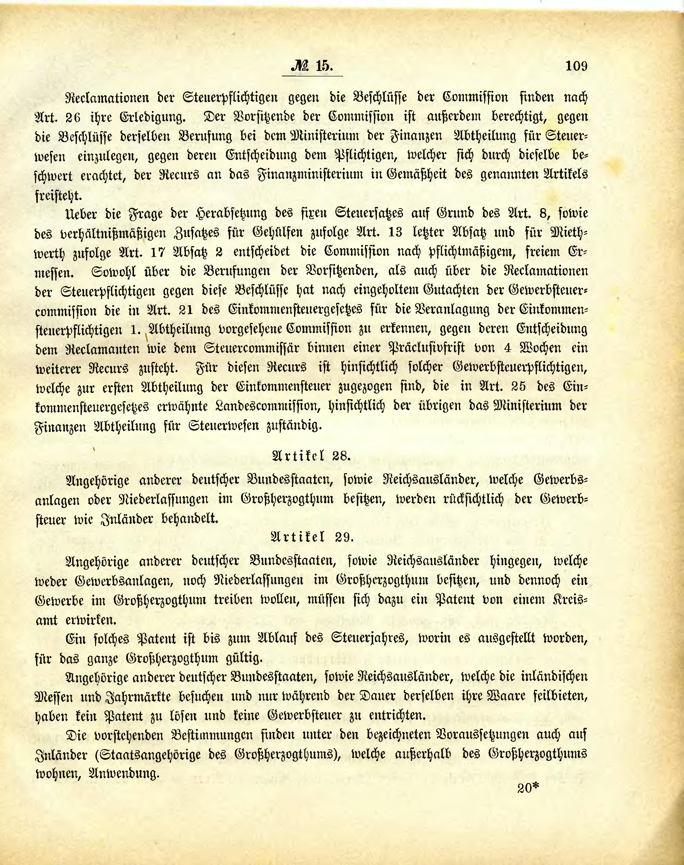 Ueber die Frage der Herabsetzung des fixen Steuersatzes auf Grund des Art. 8, sowie des verhältnißmäßigen Zusatzes für Gehülfen zufolge Art. 13 letzter Absatz und für Miethwerth zufolge Art. 17 Absatz 2 entscheidet die Commission nach pflichtmäßigem, freiem Ermessen. Sowohl über die Berufungen der Vorsitzenden, als auch über die Reclamationen der Steuerpflichtigen gegen diese Beschlüsse hat nach eingeholtem Gutachten der Gewerbsteuercommission die in Art. 21 des Einkommensteuergesetzes für die Veranlagung der Einkommensteuerpflichtigen 1. Abtheilung vorgesehene Commission zu erkennen, gegen deren Entscheidung dem Reclamanten wie dem Steuercommissär binnen einer Präclusivfrist von 4 Wochen ein weiterer Recurs zusteht. Für diesen Recurs ist hinsichtlich solcher Gewerbsteuerpflichtigen, welche zur ersten Abtheilung der Einkommensteuer zugezogen sind, die in Art. 25 des Einkommensteuergesetzes erwähnte Landescommission, hinsichtlich der übrigen das Ministerium der Finanzen Abtheilung für Steuerwesen zuständig.