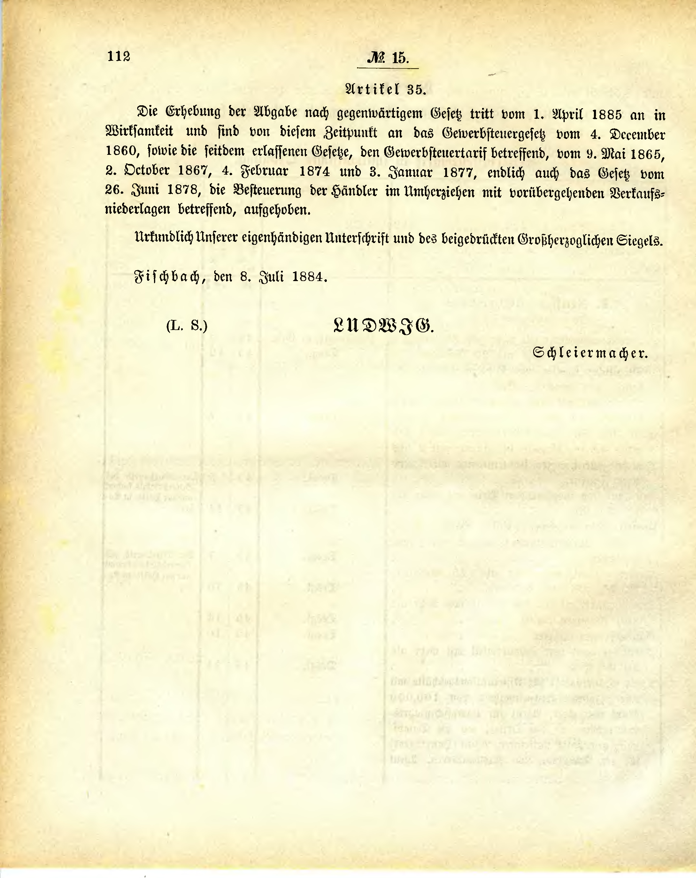 Die Erhebung der Abgabe nach gegenwärtigem Gesetz tritt vom 1. April 1885 an in Wirksamkeit und sind von diesem Zeitpunkt an das Gewerbsteuergesetz vom 4. December 1860, sowie die seitdem erlassenen Gesetze, den Gewerbsteuertarif betreffend, vom 9. Mai 1865, 2. October 1867, 4. Februar 1874 und 3. Januar 1877, endlich auch das Gesetz vom 26. Juni 1878, die Besteuerung der Händler im Umherziehen mit vorübergehenden Verkaufsniederlagen betreffend, aufgehoben.