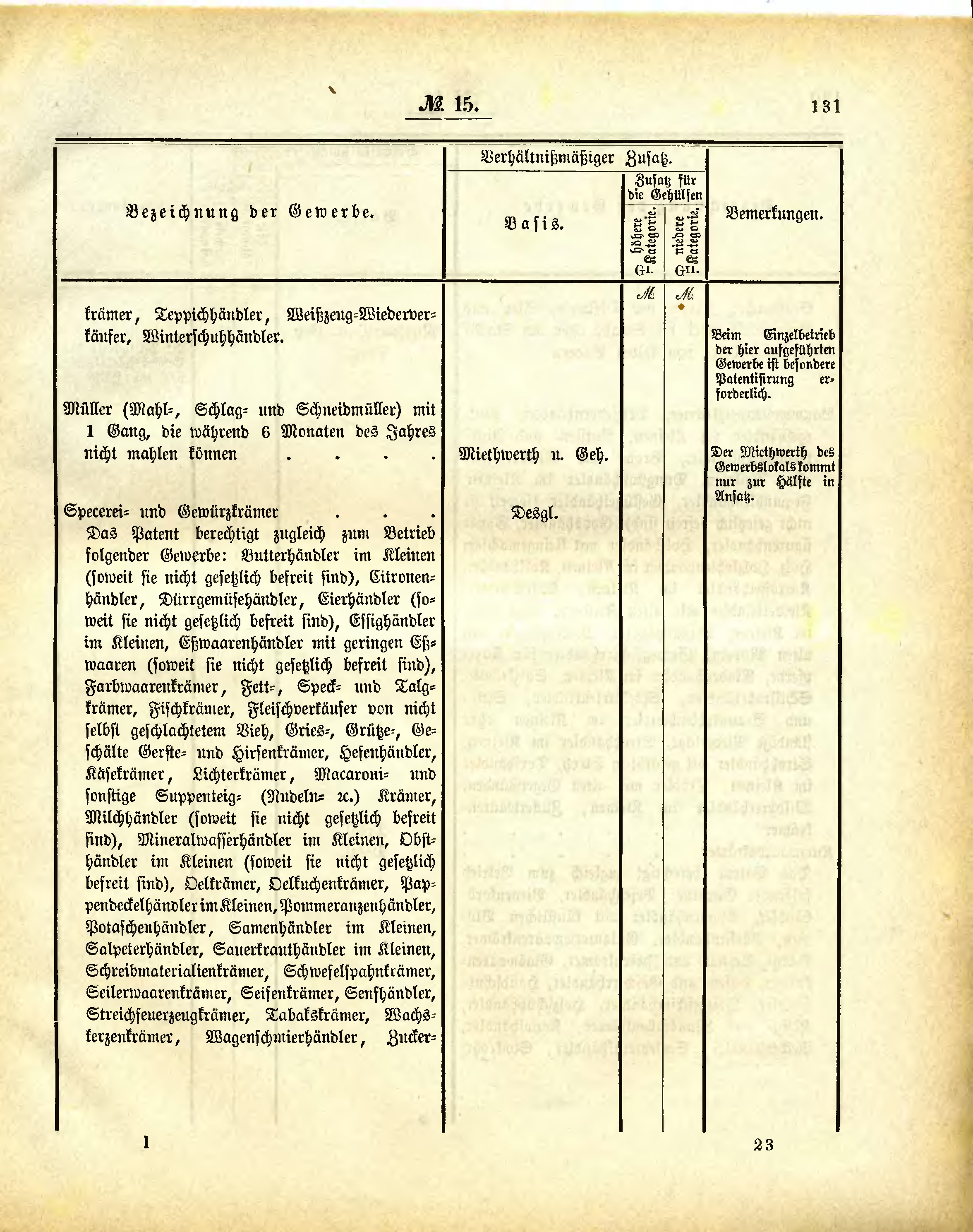 Das Patent berechtigt zugleich zum Betrieb folgender Gewerbe: Butterhändler im Kleinen (soweit sie nicht gesetzlich befreit sind), Citronenhändler, Dürrgemüsehändler, Eierhändler (soweit sie nicht gesetzlich befreit sind), Essighändler im Kleinen, Eßwaarenhändler mit geringen Eßwaaren (soweit sie nicht gesetzlich befreit sind), Farbwaarenkrämer, Fett-, Speck- und Talgkrämer, Fischkrämer, Fleischverkäufer von nicht selbst geschlachtetem Vieh, Gries-, Grütze-, Geschälte Gerste- und Hirsenkrämer, Hefenhändler, Käsekrämer, Lichterkrämer, Macaroni- und sonstige Suppenteig- (Nudeln- etc.) Krämer, Milchhändler (soweit sie nicht gesetzlich befreit sind), Mineralwasserhändler im Kleinen, Obsthändler im Kleinen (soweit sie nicht gesetzlich befreit sind), Oelkrämer, Oelkuchenkrämer, Pappendeckelhändler im Kleinen, Pommeranzenhändler, Potaschenhändler, Samenhändler im Kleinen, Salpeterhändler, Sauerkrauthändler im Kleinen, Schreibmaterialienkrämer, Schwefelspahnkrämer, Seilerwaarenkrämer, Seifenkrämer, Senfhändler, Streichfeuerzeugkrämer, Tabakskrämer, Wachskerzenkrämer, Wagenschmierhändler, Zuckerwaarenkrämer,