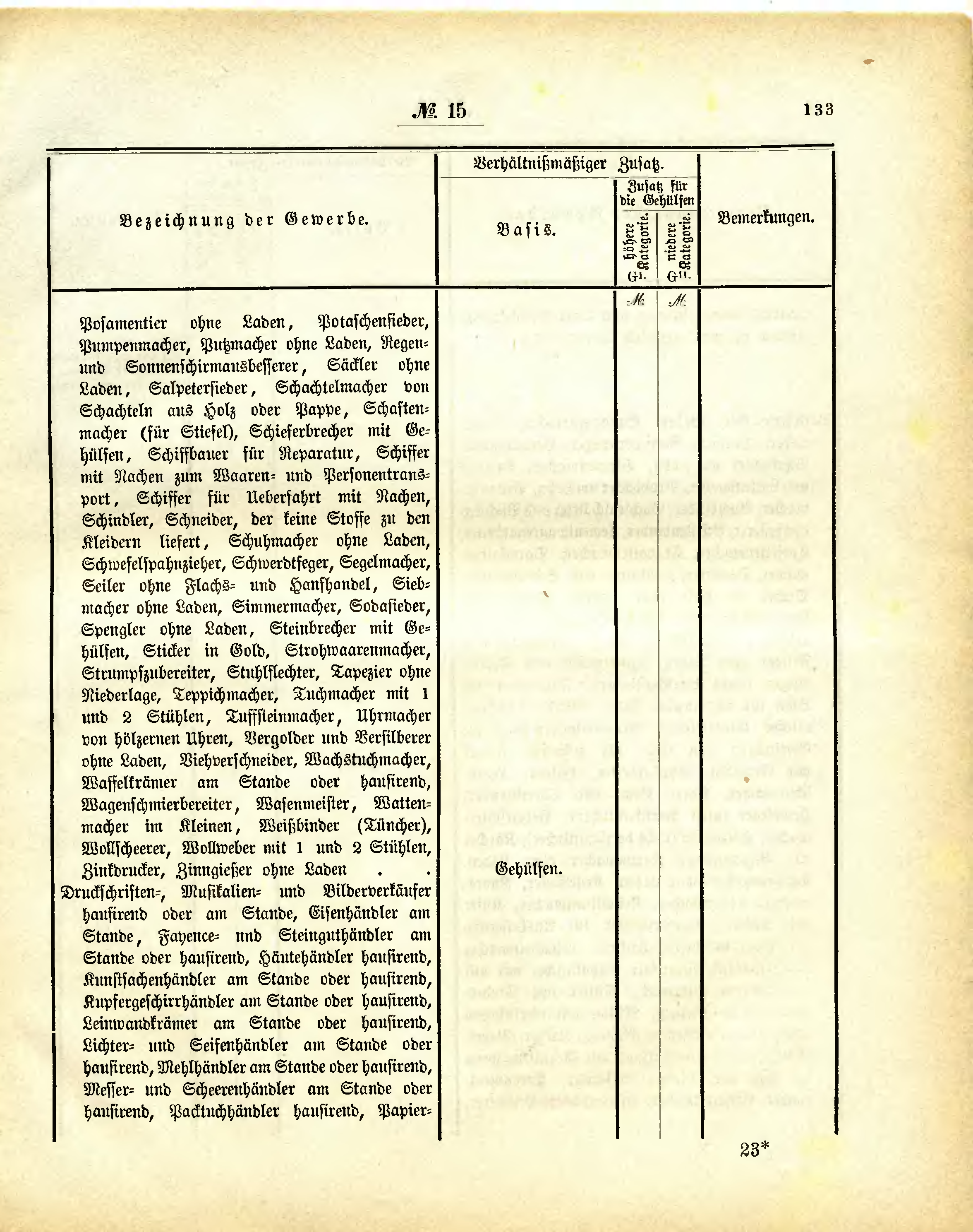 Posamentier ohne Laden, Potaschensieder, Pumpenmacher, Putzmacher ohne Laden, Regen- und Sonnenschirmausbesserer, Säckler ohne Laden, Salpeterfieder, Schachtelmacher von Schachteln aus Holz oder Pappe, Schaftenmacher (für Stiefel), Schieferbrecher mit Gehülfen, Schiffbauer für Reparatur, Schiffer mit Nachen zum Waaren- und Personentransport, Schiffer für Ueberfahrt mit Nachen, Schindler, Schneider, der keine Stoffe zu den Kleidern liefert, Schuhmacher ohne Laden, Schwefelspahnzieher, Schwerdtfeger, Segelmacher, Seiler ohne Flachs- und Hanfhandel, Siebmacher ohne Laden, Simmermacher, Sodasieder, Spengler ohne Laden, Steinbrecher mit Gehülfen, Sticker in Gold, Strohwaarenmacher, Strumpfzubereiter, Stuhlflechter, Tapezier ohne Niederlage, Teppichmacher, Tuchmacher mit 1 und 2 Stühlen, Tuffsteinmacher, Uhrmacher von hölzernen Uhren, Vergolder und Versilberer ohne Laden, Viehverschneider, Wachstuchmacher, Waffelkrämer am Stande oder hausirend, Wagenschmierbereiter, Wasenmeister, Wattenmacher im Kleinen, Weißbinder (Tüncher), Wollscheerer, Wollweber mit 1 und 2 Stühlen, Zinkdrucker, Zinngießer ohne Laden