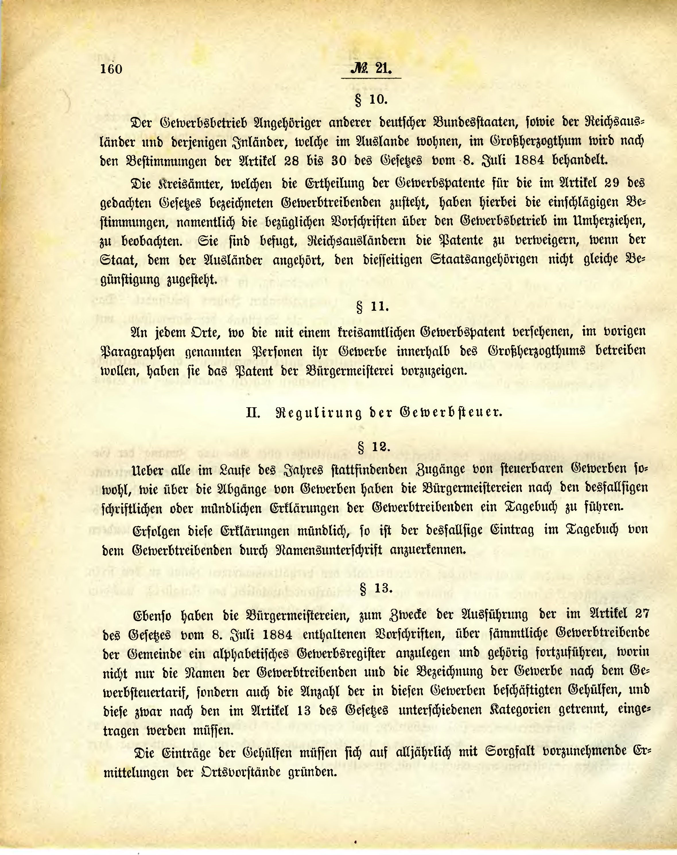 Ebenso haben die Bürgermeistereien, zum Zwecke der Ausführung der im Artikel 27 des Gesetzes vom 8. Juli 1884 enthaltenen Vorschriften, über sämmtliche Gewerbtreibende der Gemeinde ein alphabetisches Gewerbsregister anzulegen und gehörig fortzuführen, worin nicht nur die Namen der Gewerbtreibenden und die Bezeichnung der Gewerbe nach dem Gewerbsteuertarif, sondern auch die Anzahl der in diesen Gewerben beschäftigten Gehülfen, und diese zwar nach den im Artikel 13 des Gesetzes unterschiedenen Kategorien getrennt, eingetragen werden müssen.