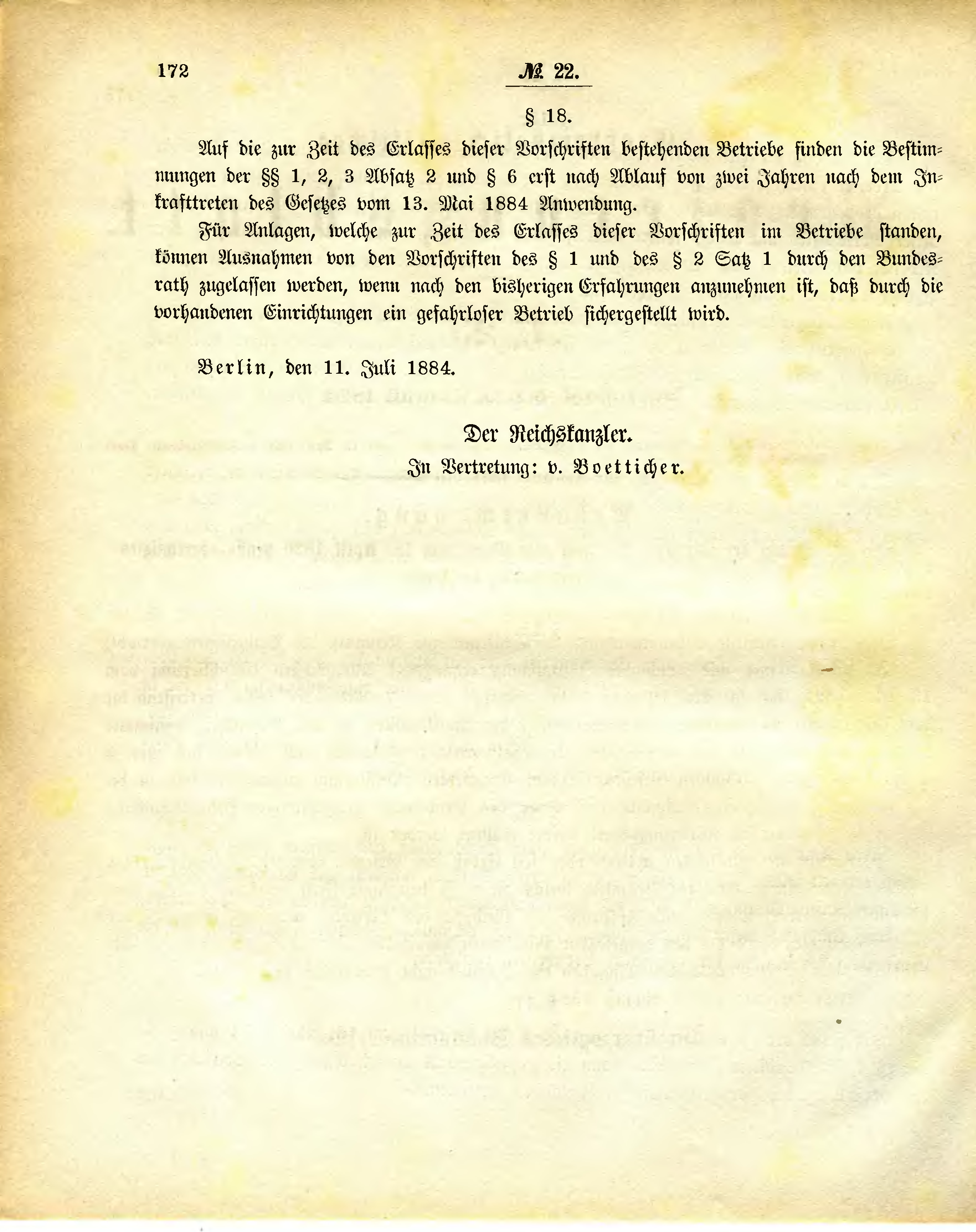 Auf die zur Zeit des Erlasses dieser Vorschriften bestehenden Betriebe finden die Bestimmungen der §§ 1, 2, 3 Absatz 2 und § 6 erst nach Ablauf von zwei Jahren nach dem Inkrafttreten des Gesetzes vom 13. Mai 1884 Anwendung.
