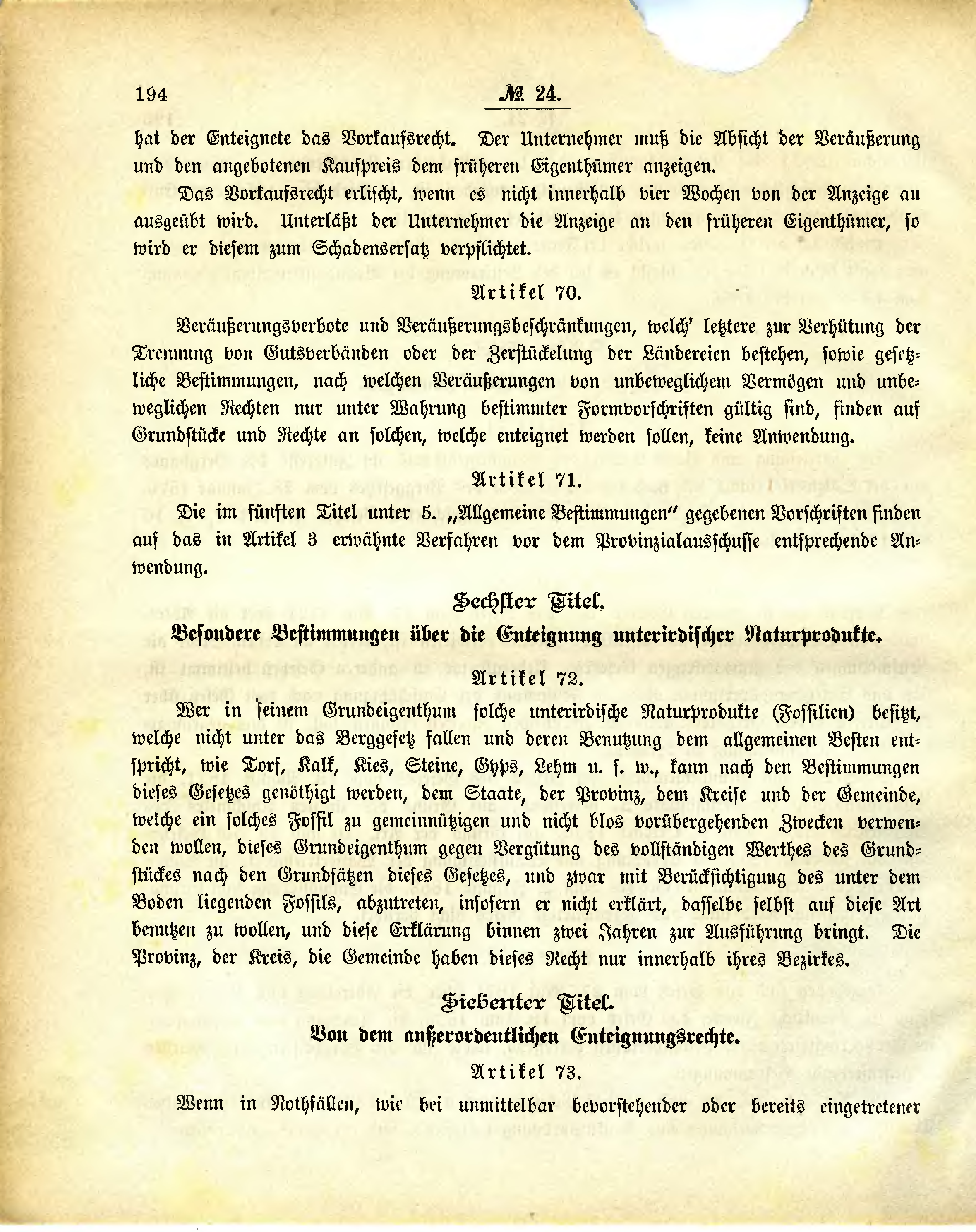 Wer in seinem Grundeigenthum solche unterirdische Naturprodukte (Fossilien) besitzt, welche nicht unter das Berggesetz fallen und deren Benutzung dem allgemeinen Besten entspricht, wie Torf, Kalk, Kies, Steine, Gyps, Lehm u. s. w., kann nach den Bestimmungen dieses Gesetzes genöthigt werden, dem Staate, der Provinz, dem Kreise und der Gemeinde, welche ein solches Fossil zu gemeinnützigen und nicht blos vorübergehenden Zwecken verwenden wollen, dieses Grundeigenthum gegen Vergütung des vollständigen Werthes des Grundstückes nach den Grundsätzen dieses Gesetzes, und zwar mit Berücksichtigung des unter dem Boden liegenden Fossils, abzutreten, insofern er nicht erklärt, dasselbe selbst auf diese Art benutzen zu wollen, und diese Erklärung binnen zwei Jahren zur Ausführung bringt. Die Provinz, der Kreis, die Gemeinde haben dieses Recht nur innerhalb ihres Bezirkes.