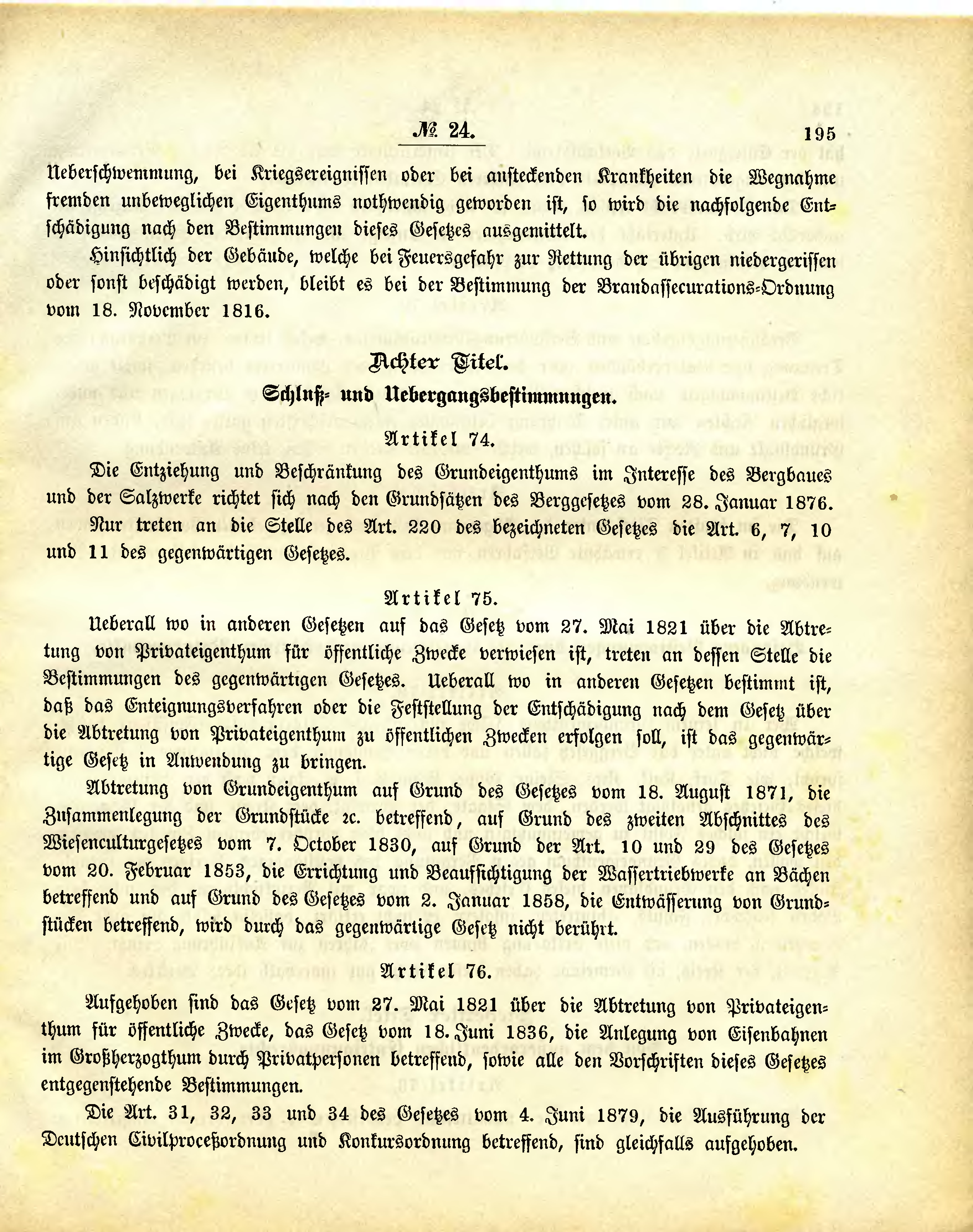 Aufgehoben sind das Gesetz vom 27. Mai 1821 über die Abtretung von Privateigenthum für öffentliche Zwecke, das Gesetz vom 18. Juni 1836, die Anlegung von Eisenbahnen im Großherzogthum durch Privatpersonen betreffend, sowie alle den Vorschriften dieses Gesetzes entgegenstehende Bestimmungen.