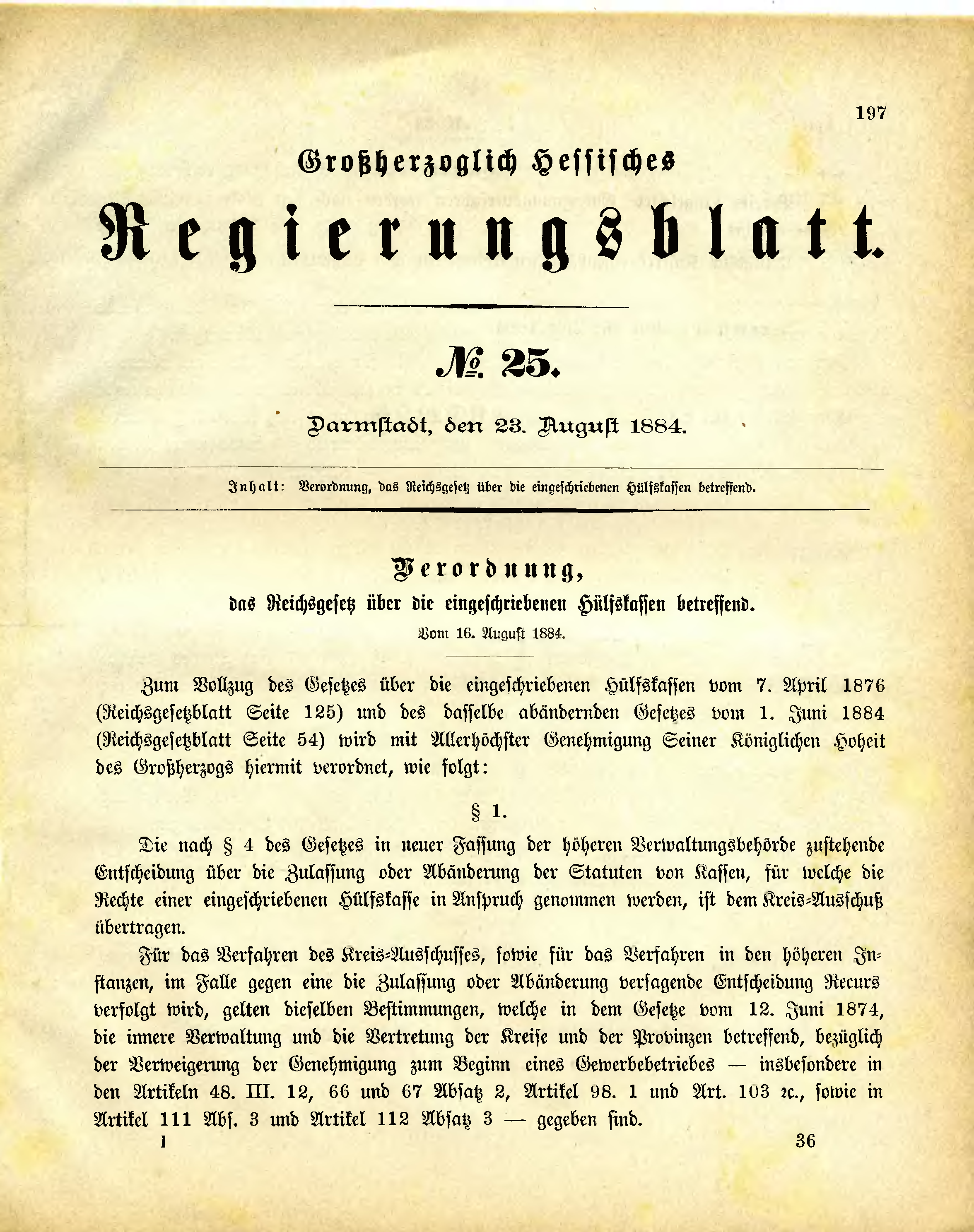 Zum Vollzug des Gesetzes über die eingeschriebenen Hülfskassen vom 7. April 1876 (Reichsgesetzblatt Seite 125) und des dasselbe abändernden Gesetzes vom 1. Juni 1884 (Reichsgesetzblatt Seite 54) wird mit Allerhöchster Genehmigung Seiner Königlichen Hoheit des Großherzogs hiermit verordnet, wie folgt: