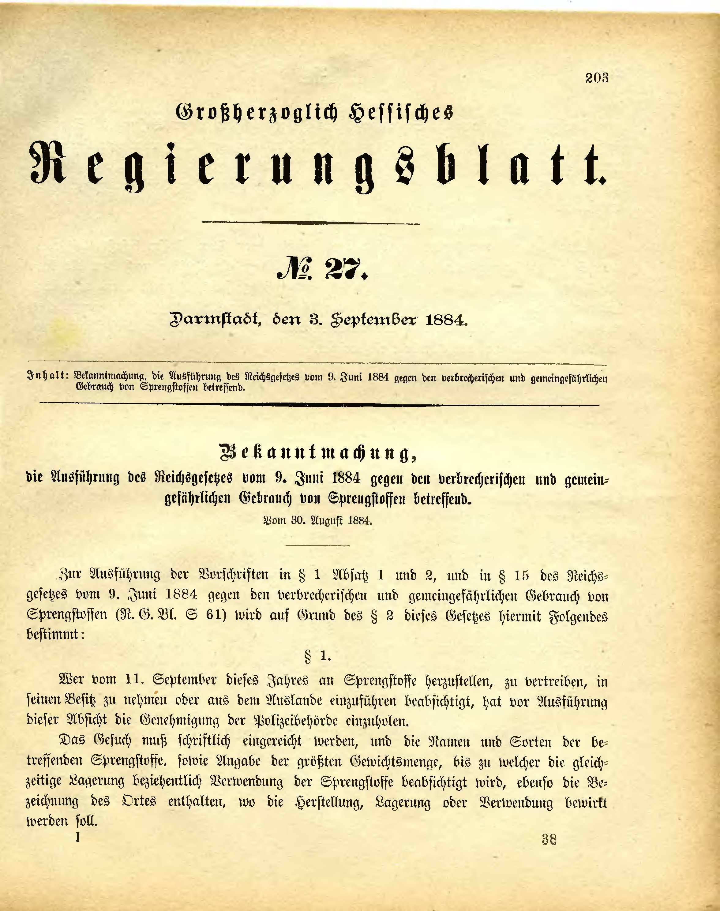 | Inhalt: | Bekanntmachung, die Ausführung des Reichsgesetzes vom 9. Juni 1884 gegen den verbrecherischen und gemeingefährlichen Gebrauch von Sprengstoffen betreffend. |