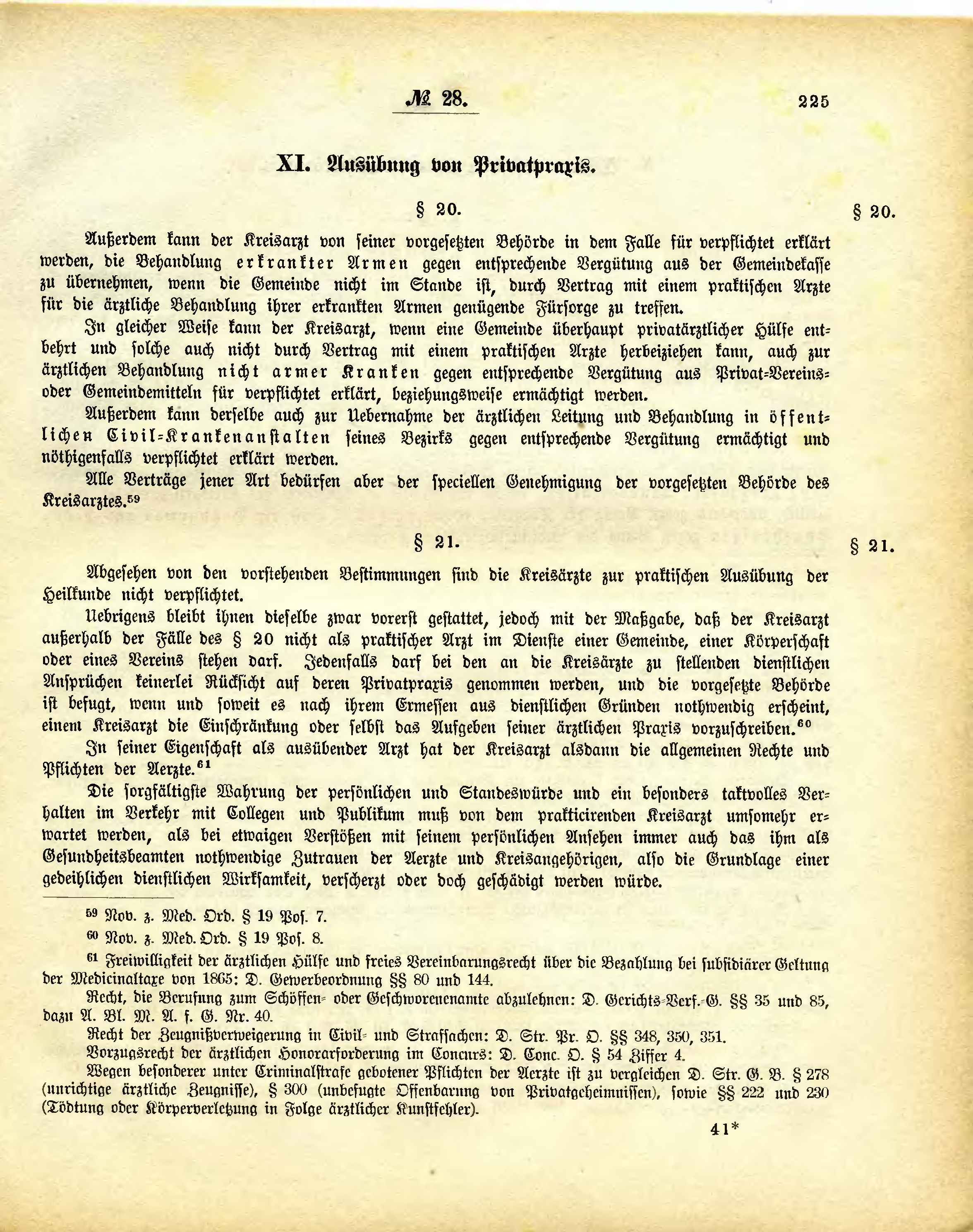 Wegen besonderer unter Criminalstrafe gebotener Pflichten der Aerzte ist zu vergleichen D. Str. G. B. § 278 (unrichtige ärztliche Zeugnisse), § 300 (unbefugte Offenbarung von Privatgeheimnissen), sowie §§ 222 und 230 (Tödtung oder Körperverletzung in Folge ärztlicher Kunstfehler).