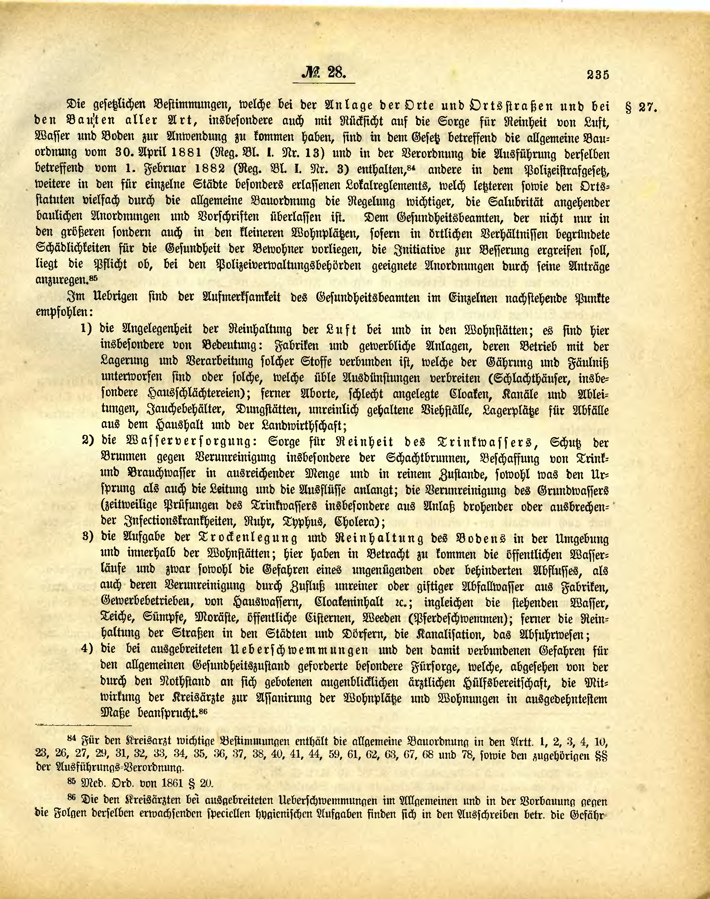 Die gesetzlichen Bestimmungen, welche bei der Anlage der Orte und Ortsstraßen und bei den Bauten aller Art, insbesondere auch mit Rücksicht auf die Sorge für Reinheit von Luft, Wasser und Boden zur Anwendung zu kommen haben, sind in dem Gesetz betreffend die allgemeine Bauordnung vom 30. April 1881 (Reg. Bl. I. Nr. 13) und in der Verordnung die Ausführung derselben betreffend vom 1. Februar 1882 (Reg. Bl. I. Nr. 3) enthalten,84 andere in dem Polizeistrafgesetz, weitere in den für einzelne Städte besonders erlassenen Lokalreglements, welch letzteren sowie den Ortsstatuten vielfach durch die allgemeine Bauordnung die Regelung wichtiger, die Salubrität angehender baulichen Anordnungen und Vorschriften überlassen ist. Dem Gesundheitsbeamten, der nicht nur in den größeren sondern auch in den kleineren Wohnplätzen, sofern in örtlichen Verhältnissen begründete Schädlichkeiten für die Gesundheit der Bewohner vorliegen, die Initiative zur Besserung ergreifen soll, liegt die Pflicht ob, bei den Polizeiverwaltungsbehörden geeignete Anordnungen durch seine Anträge anzuregen.85