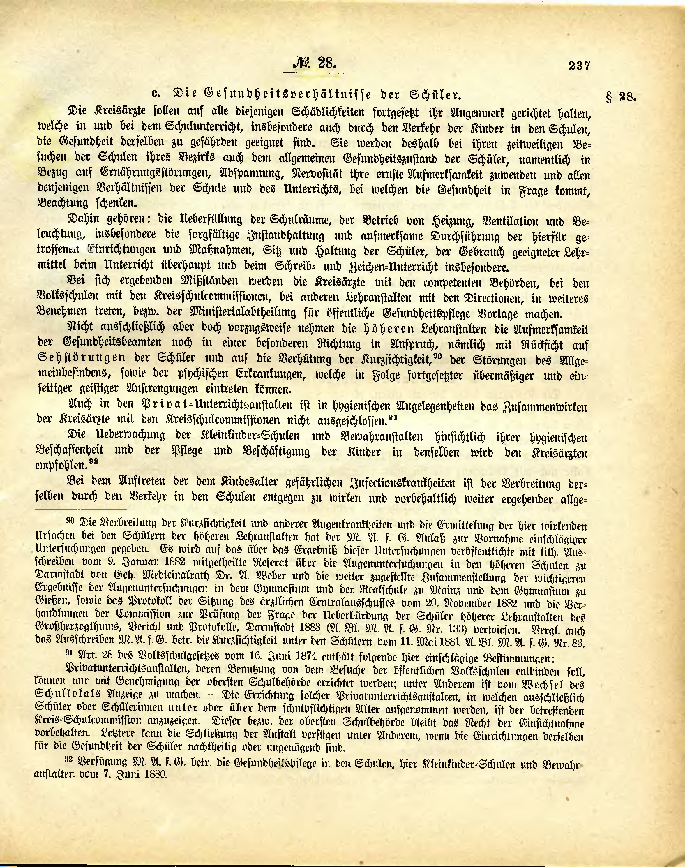 Nicht ausschließlich aber doch vorzugsweise nehmen die höheren Lehranstalten die Aufmerksamkeit der Gesundheitsbeamten noch in einer besonderen Richtung in Anspruch, nämlich mit Rücksicht auf Sehstörungen der Schüler und auf die Verhütung der Kurzsichtigkeit,90 der Störungen des Allgemeinbefindens, sowie der psychischen Erkrankungen, welche in Folge fortgesetzter übermäßiger und einseitiger geistiger Anstrengungen eintreten können.