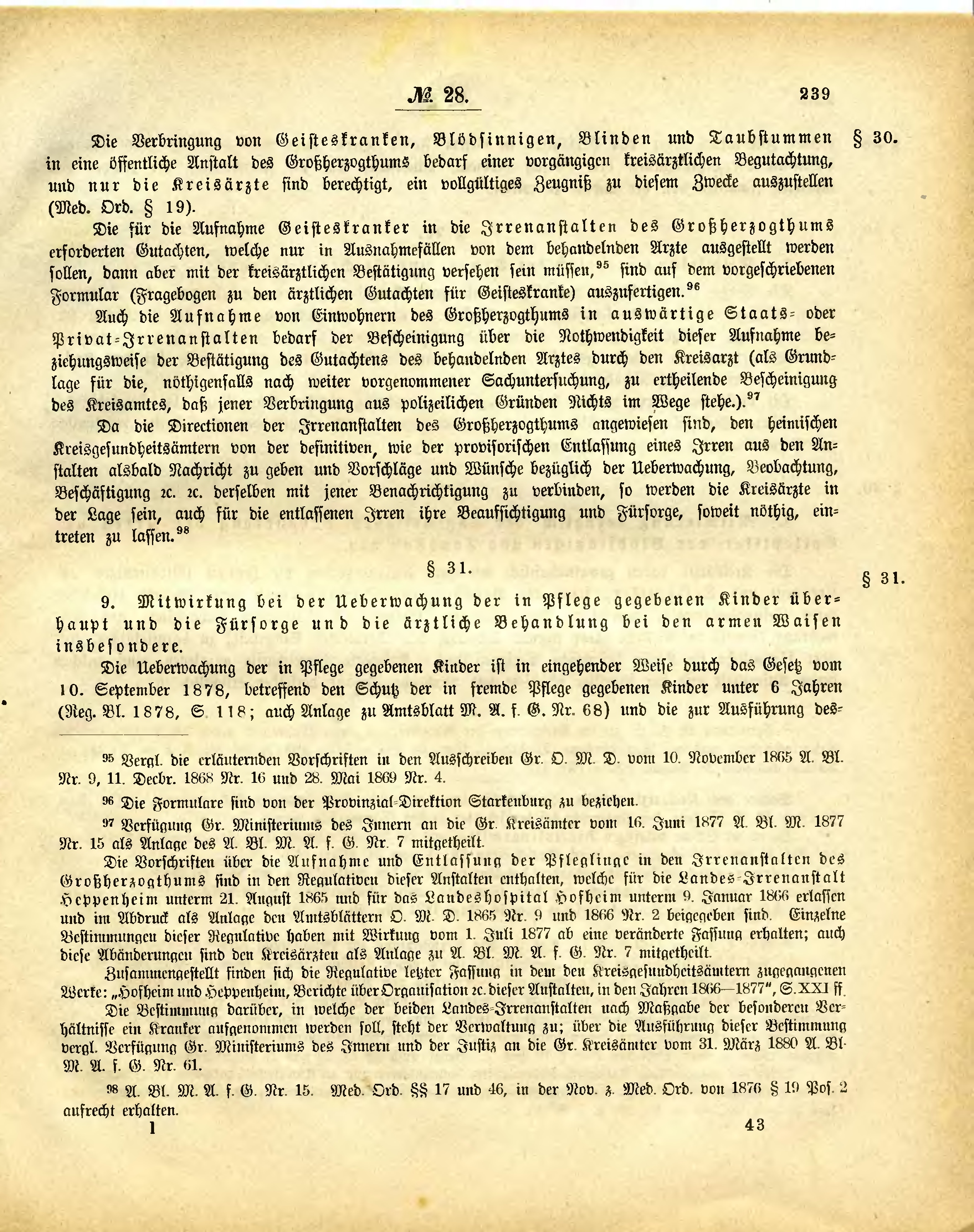 | Die Verbringung von Geisteskranken, Blödsinnigen, Blinden und Taubstummen}} in eine öffentliche Anstalt des Großherzogthums bedarf einer vorgängigen kreisärztlichen Begutachtung, und nur die Kreisärzte sind berechtigt, ein vollgültiges Zeugniß zu diesem Zwecke auszustellen (Med. Ord. § 19). Die für die Aufnahme Geisteskranker in die Irrenanstalten des Großherzogthumserforderten Gutachten, welche nur in Ausnahmefällen von dem behandelnden Arzte ausgestellt werden sollen, dann aber mit der kreisärztlichen Bestätigung versehen sein müssen,95 sind auf dem vorgeschriebenen Formular (Fragebogen zu den ärztlichen Gutachten für Geisteskranke) auszufertigen.96 Auch die Aufnahme von Einwohnern des Großherzogthums in auswärtige Staats- oder Privat-Irrenanstalten bedarf der Bescheinigung über die Nothwendigkeit dieser Aufnahme beziehungsweise der Bestätigung des Gutachtens des behandelnden Arztes durch den Kreisarzt (als Grundlage für die, nöthigenfalls nach weiter vorgenommener Sachuntersuchung, zu ertheilende Bescheinigung des Kreisamtes, daß jener Verbringung aus polizeilichen Gründen Nichts im Wege stehe.).97 Da die Directionen der Irrenanstalten des Großherzogthums angewiesen sind, den heimischen Kreisgesundheitsämtern von der definitiven, wie der provisorischen Entlassung eines Irren aus den Anstalten alsbald Nachricht zu geben und Vorschläge und Wünsche bezüglich der Ueberwachung, Beobachtung, Beschäftigung etc. etc. derselben mit jener Benachrichtigung zu verbinden, so werden die Kreisärzte in der Lage sein, auch für die entlassenen Irren ihre Beaufsichtigung und Fürsorge, soweit nöthig, eintreten zu lassen.98 |
